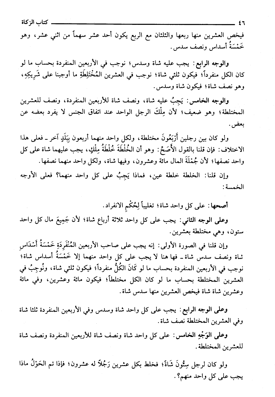 والوجه الرابع: يجب عليه شاة وسدس؛ نوجب في الأربعين المنفردة بحساب ما لو كان الكل منفرداً؛ فيون ثلثي شاة؛ نوجب في العشرين المختلطة ما أوجبنا على شريكه، وهو نصف شاة؛ فيون شاة وسدس.