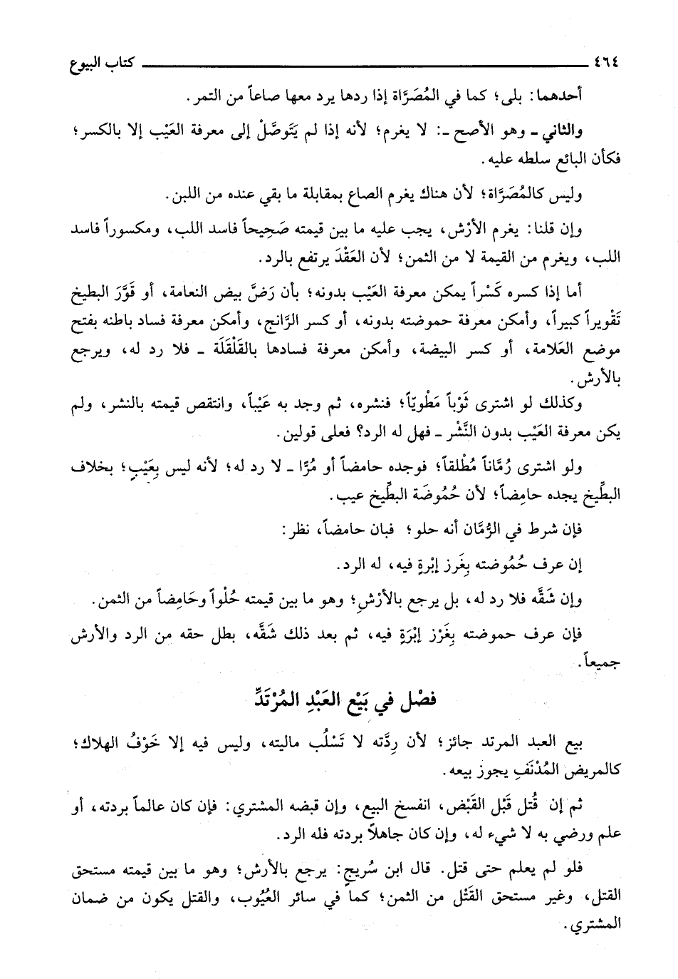 أما إذا كسره كسراً يمكن معرفة العيب بدونه؛ بأن رض بيض النعامة، أو قور البطيخ تقويراً كبيراً، وأمكن معرفة حموضته بدونه، أو كسر الرانج، وأمكن معرفة فساد باطنه بفتح موضع العلامة، أو كسر البيضة، وأمكن معرفة فسادها بالقلقلة - فلا رد له، ويرجع بالأرض.