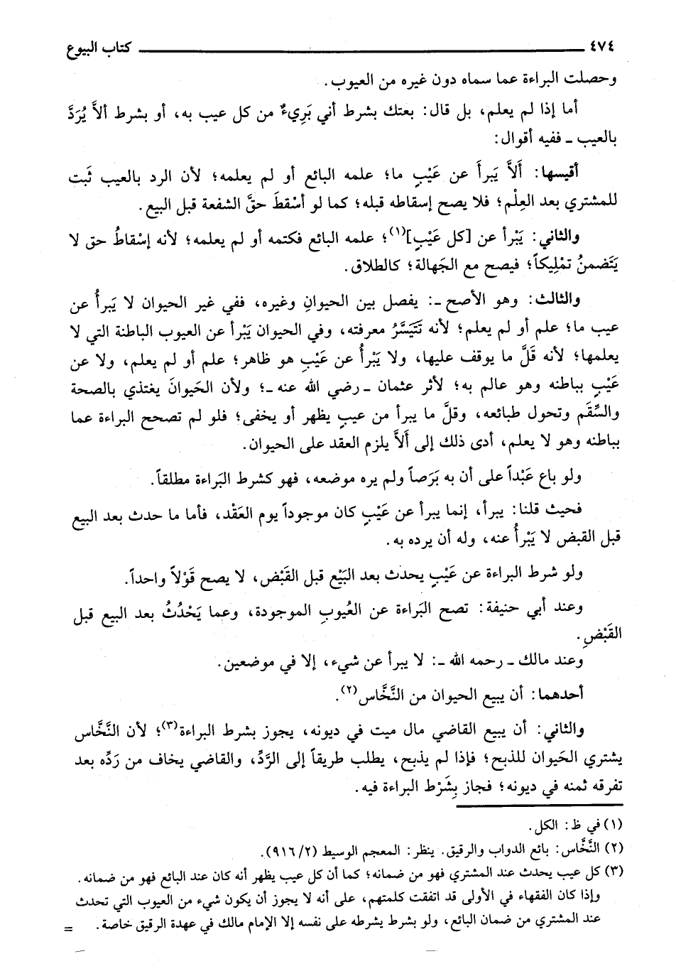 والثالث: وهو الأصح -: يفصل بين الحيوان وغيره، ففي غير الحيوان لا يبرأ عن عيب ما؛ علم أو لم يعلم؛ لأنه تتيسر معرفته، وفي الحيوان يبرأ عن العيوب الباطنة التي لا يعلمها؛ لأنه قل ما يوقف عليها، ولا يبرأ عن عيب هو ظاهر؛ علم أو لم يعلم، ولا عن عيب بباطنه وهو عالم به؛ لأثر عثمان - رضي الله عنه-؛ ولأن الحيوان يغتذي بالصحة والسقم وتحول طبائعه، وقل ما يبرا من عيب يظهر أو يخفي؛ فلو لم تصحح البراءة عما بباطنه وهو لا يعلمن أدى ذلك إلى ألا يلزم العقد على الحيوان.