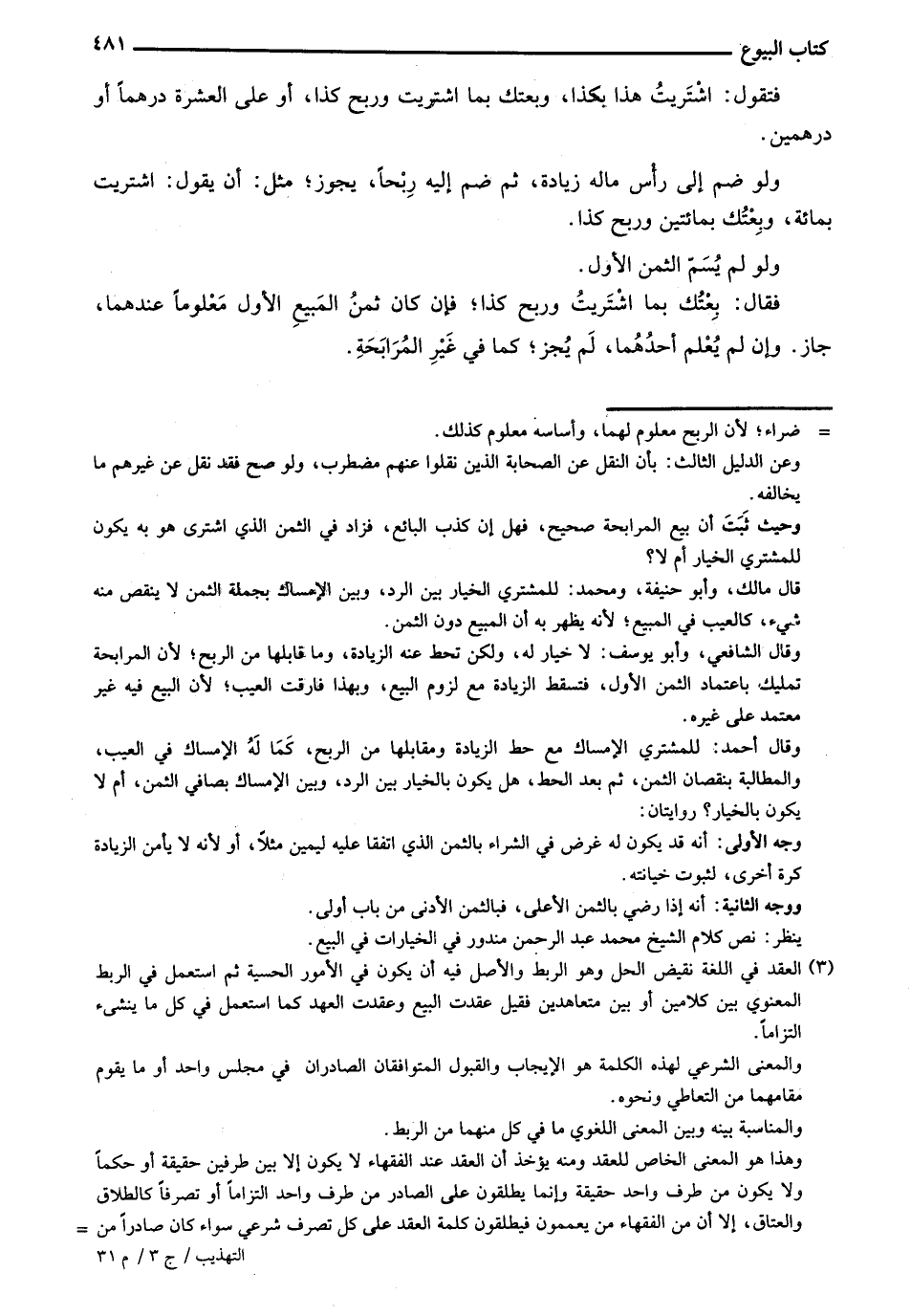 فنقول: اشتريت هذا بكذا، وبعتك بما اشتريت وربح كذا، أو على العشرة درهماً أو درهمين.