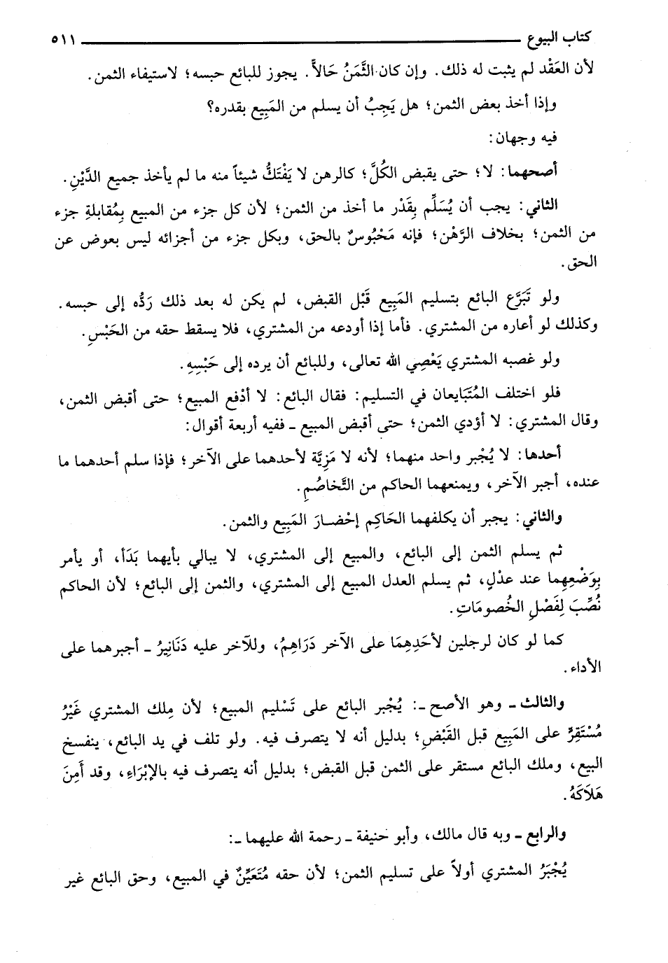 والثالث - وهو الأصح -: يُجبر البائع على تسليم المبيع؛ لأن ملك المشتري غير مستر على المبيع قبل القبض؛ بدليل أنه لا يتصرف فيه. ولو تلف في يد البائع، ينفسخ البيع، وملك البائع مستقر على الثمن قبل القبض؛ بدليل أنه يتصرف فيه بالإبراء، وقد أمن هلاكه.