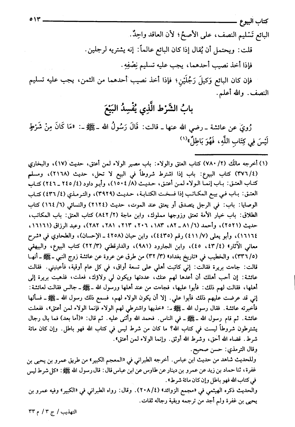 رُوي عن عائشة - رضي الله عنها - قالت: قال رسول الله - صلى الله عليه وسلم -: "ما كان من شرط ليس في تاب الله، فهو باطل".