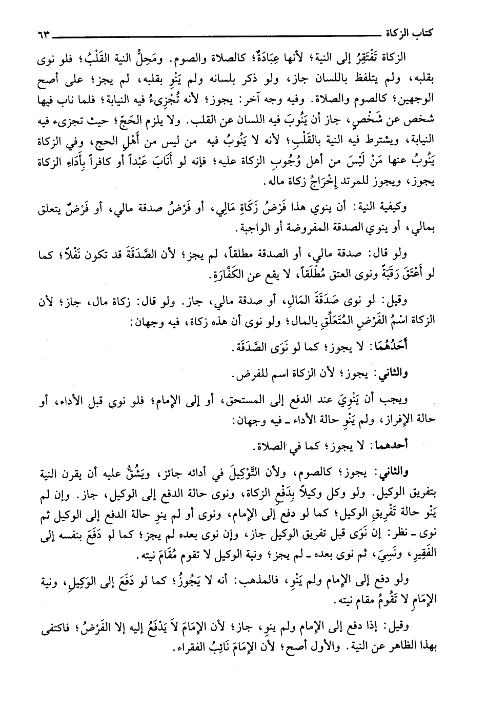 الزكاة تفتقر إلى النية؛ لأنها عبادة؛ كالصلاة والصوم. ومحل النية القلب؛ فلو نوى بقلبه، ولم يتلفظ باللسان جاز، ولو ذكر بلسانه ولم ينو بقلبه، لم يجز؛ على أصح الوجهين؛ كالصوم والصلاة. وفيه وجه آخر: يجوز؛ لأنه تجزيء فيه النيابة؛ فلما ناب فيها شخص عن شخص، جاز أن ينوب فيه اللسان عن القلب. ولا يلزم الحج؛ حيث تجزيء فيه النيابة، ويشترط فيه النية بالقلب؛ لأنه لا ينوب فيه من ليس من أهل الحج، وفي الزكاة ينوب عنها من ليس من أهل وجوب الزكاة عليه؛ فنه لو أناب عبداً أو كافراً بأداء الزكاة يجوز، ويجوز للمرتد إخراج زكاة ماله.