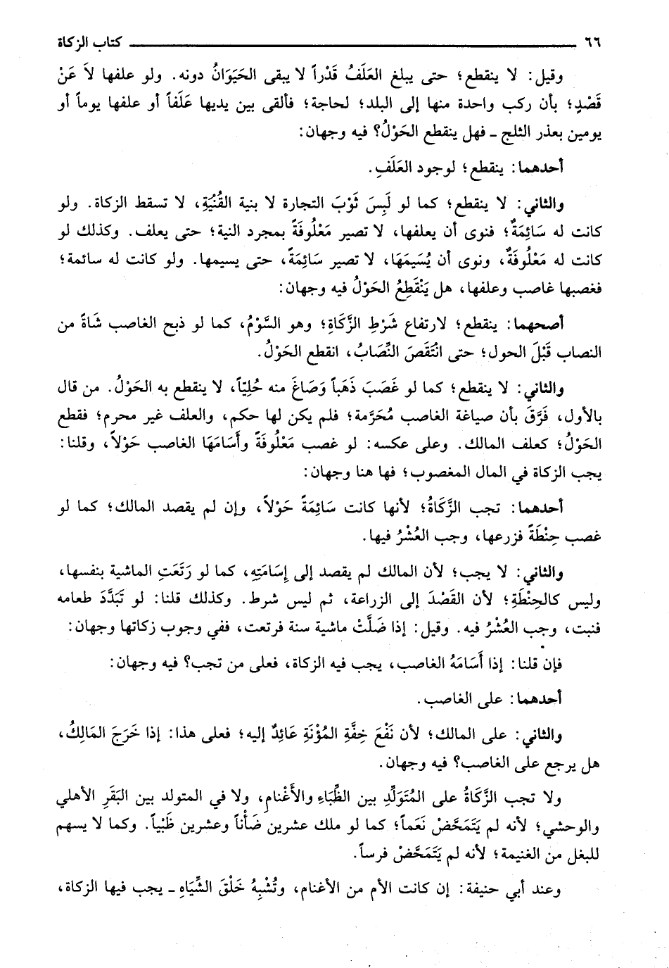 والثاني: لا ينقطع؛ كما لو غصب ذهباً وصاغ منه حلياً، لا ينقطع به الحول. من قال بالأول، فرق بأن صياغة الغاصب محرمة؛ فمل يكن لها حكم، والعلف غير محرم؛ فقطع الحول؛ كعلف المالك. وعلى عكسه: لو غصب معلوفة وأسامها الغاصب حولاً، وقلنا: يجب الزكاة في المال المغصوب؛ فهاهنا وجهان:
