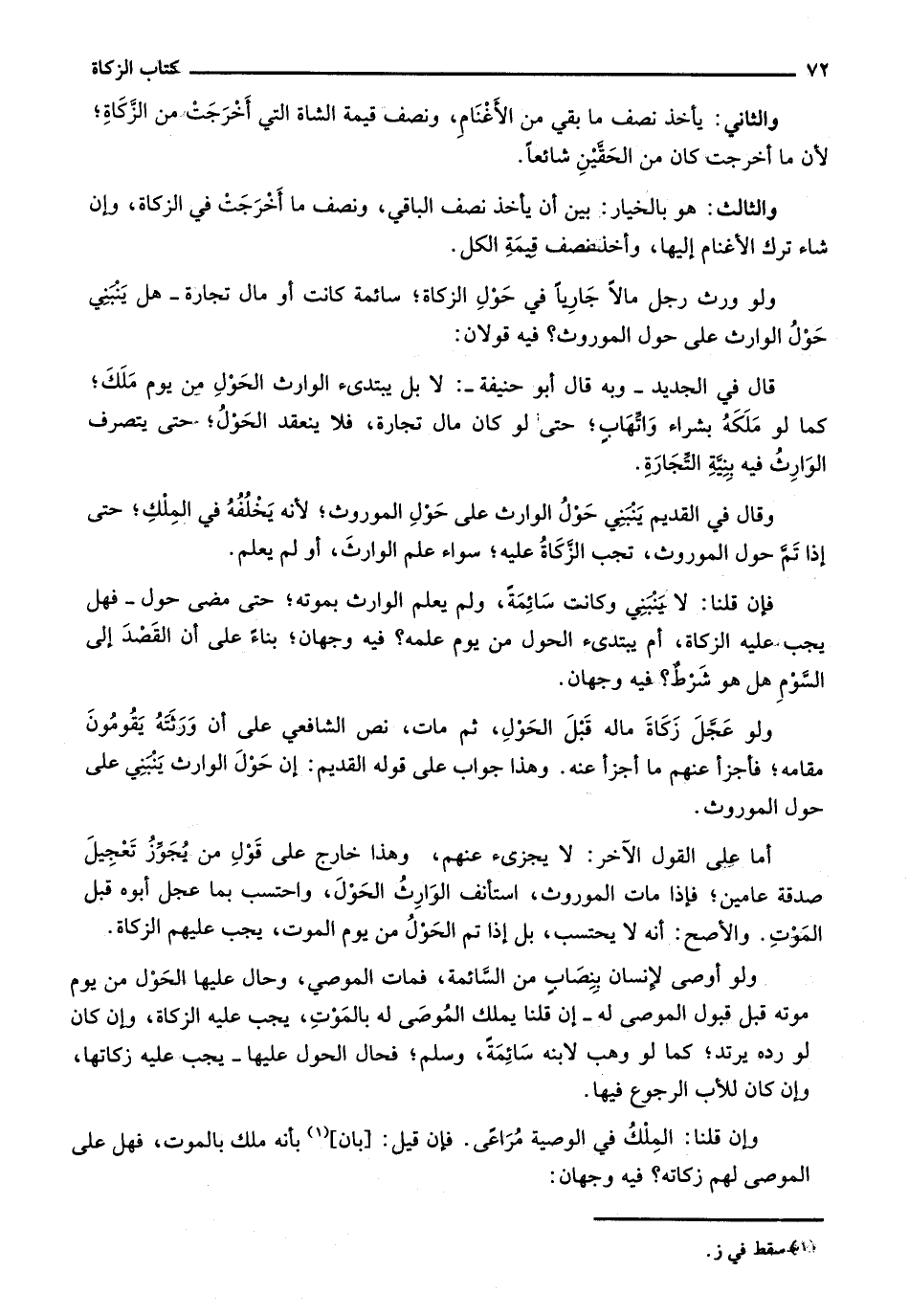 وقال في القديم ينبني حول الوارث على حول الموروث؛ لأنه يخلفه في الملك؛ حتى إذا تم حول الموروث، تجب الزكاة عليه؛ سواء علم الوارث، أو لم يعلم.