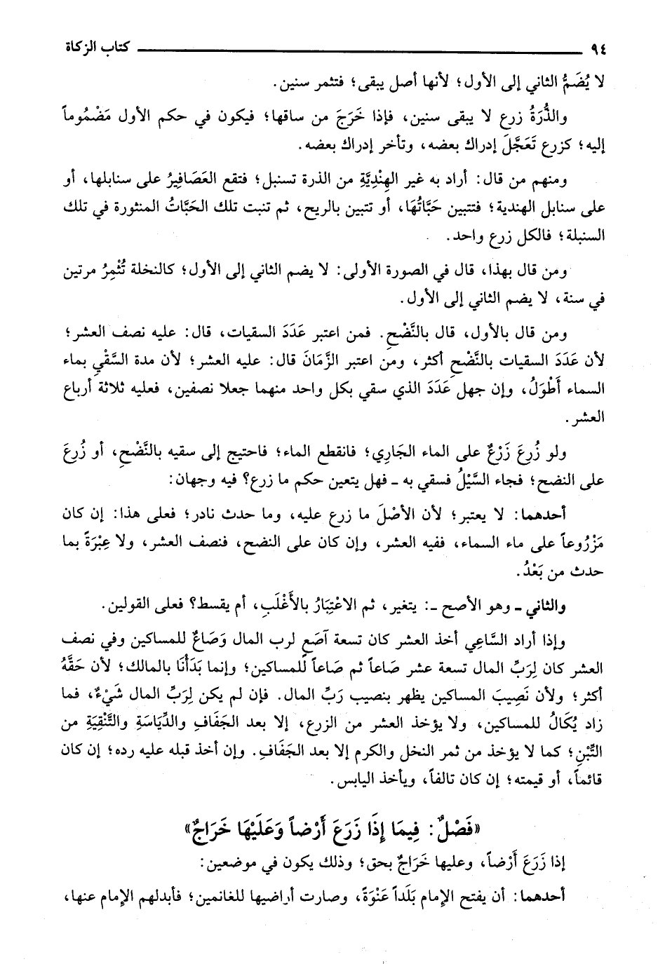 ومن قال بالأول، قال بالنضح. فمن اعتبر عدد السقيات، قال عليه نصف العشر؛ لأن عدد السقيات بالنضح أكثر، ومن اعتبر الزمان قال: عليه العشر؛ لأن مدة السقي بماء السماء أطول، وإن جهل عدد الذي سقي بل واحد منهما جعلا نصفين، فعليه ثلاث أرباع العشر.