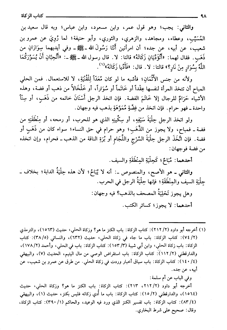 والثاني: يجب؛ وهو قول عمر، وابن مسعود، وابن عباس؛ وبه قال سعيد بن المسيب، وعطاء، ومجاهد، والزهري، والثوري، وأبو حنيفة؛ لما رُوي عن عمرو بن شعيب، عن أبيه، عن جده؛ أن امرأتين أتتا رسول الله - صلى الله عليه وسلم- وفي أيديهما سواران من ذهب. فقال لهما: "أتؤديان زكاته" قالتا: لا. قال رسول الله - صلى الله عليه وسلم -: "أتحبان أن يسوركما الله بسوار من نار؟ " قالتا: لا. قال: "فأديا زكاته".