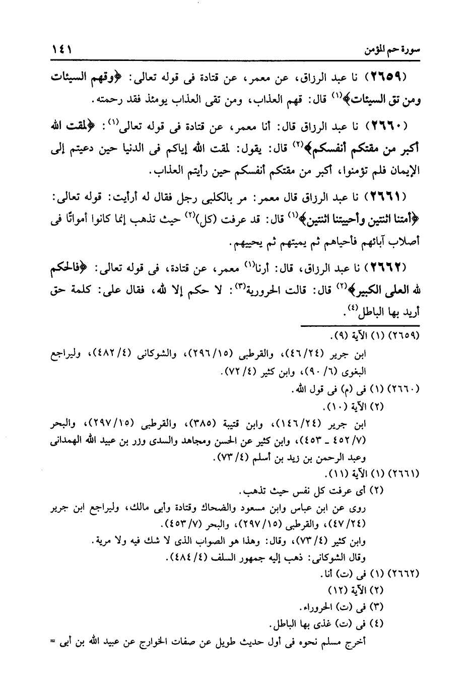 2662 - نا عَبْدُ الرَّزَّاقِ قَالَ: أرنا مَعْمَرٌ , عَنْ قَتَادَةَ , فِي قَوْلِهِ تَعَالَى: {فَالْحُكْمُ لِلَّهِ الْعَلِيِّ الْكَبِيرِ} [غافر: 12] قَالَ: قَالَتِ الْحَرُورِيَّةُ: لَا حُكْمَ إِلَّا لِلَّهِ , فَقَالَ عَلِيٌّ: «§كَلِمَةُ حَقٍّ أُرِيدَ بِهَا الْبَاطِلُ»