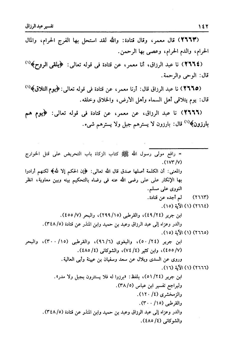 2665 - نا عَبْدُ الرَّزَّاقِ قَالَ: أرنا مَعْمَرٌ , عَنْ قَتَادَةَ , فِي قَوْلِهِ تَعَالَى: {يَوْمَ التَّلَاقِ} [غافر: 15] قَالَ: «§يَوْمَ يَتَلَاقَى أَهْلُ السَّمَاءِ , وَأَهْلُ الْأَرْضِ وَالْخَلَّاقُ وَخَلْقِهِ»
