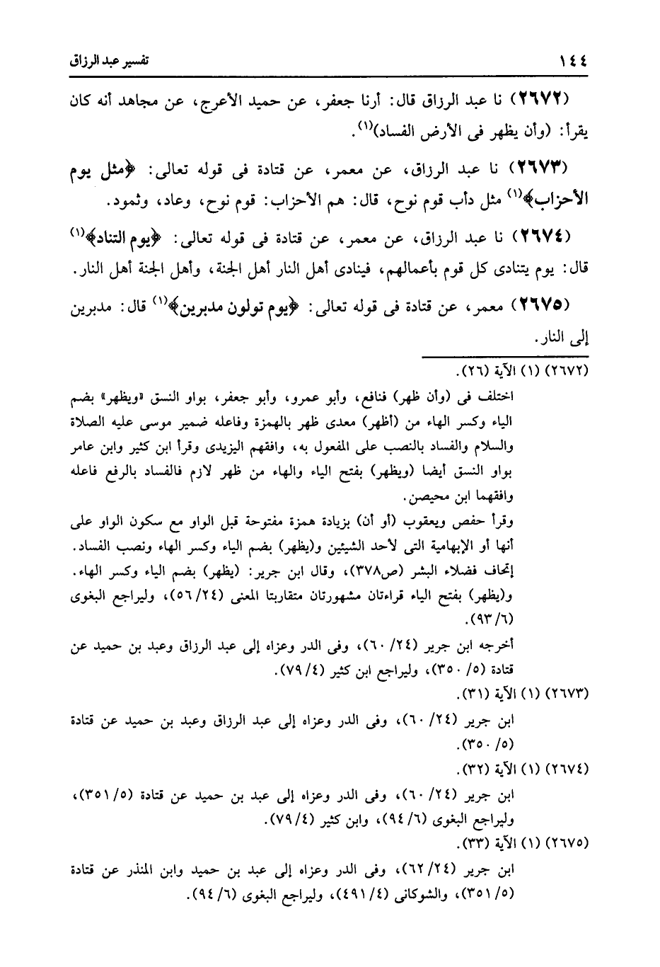 2674 - عَنْ مَعْمَرٍ , عَنْ قَتَادَةَ , فِي قَوْلِهِ تَعَالَى: {يَوْمَ التَّنَادِ} [غافر: 32] قَالَ: «§يَوْمَ يَتَنَادَى كُلُّ قَوْمٍ بِأَعْمَالِهِمْ , فَيُنَادِي أَهْلُ النَّارِ أَهْلَ الْجَنَّةِ , وَأَهْلُ الْجَنَّةِ أَهْلَ النَّارِ»