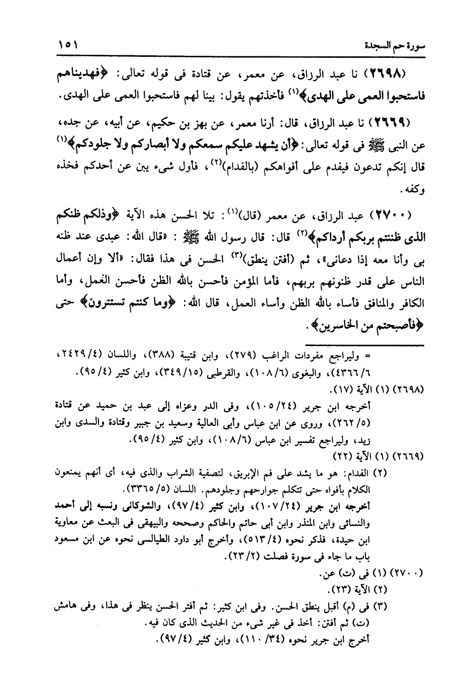2699 - نا عَبْدُ الرَّزَّاقِ قَالَ: أرنا مَعْمَرٌ , عَنْ بَهْزِ بْنِ حَكِيمٍ , عَنْ أَبِيهِ , عَنْ جَدِّهِ , عَنِ النَّبِيِّ صَلَّى اللهُ عَلَيْهِ وَسَلَّمَ فِي قَوْلِهِ تَعَالَى: {أَنْ يَشْهَدَ عَلَيْكُمْ سَمْعُكُمْ وَلَا أَبْصَارُكُمْ وَلَا جُلُودُكُمْ} [فصلت: 22] قَالَ: «§إِنَّكُمْ تُدْعَوْنَ فَيُفْدَمُ عَلَى أَفْوَاهِكُمْ بِالْفِدَامِ , فَأَوَّلُ شَيْءٍ يُبِينُ عَنْ أَحَدِكُمْ فَخِذُهُ وَكَفُّهُ»