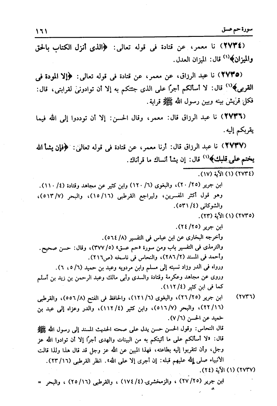2735 - عَنْ مَعْمَرٍ , عَنْ قَتَادَةَ , فِي قَوْلِهِ تَعَالَى: {إِلَّا الْمَوَدَّةَ فِي الْقُرْبَى} [الشورى: 23] قَالَ: لَا أَسْأَلُكُمْ أَجْرًا عَلَى الَّذِي جِئْتُكُمْ بِهِ إِلَّا أَنْ تُوَادُّونِي لِقَرَابَتِي , قَالَ: «§فَكُلُّ قُرَيْشٍ بَيْنَهُمْ وَبَيْنَ رَسُولِ اللَّهِ صَلَّى اللهُ عَلَيْهِ وَسَلَّمَ قَرَابَةٌ»