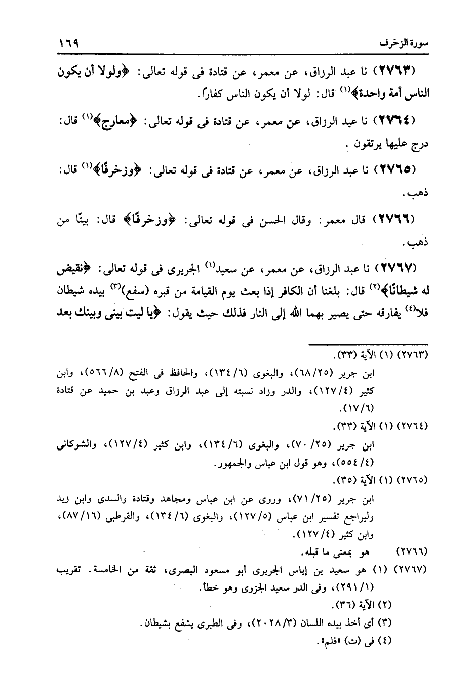 2767 - عَنْ مَعْمَرٍ , عَنْ سَعِيدٍ الْجُرَيْرِيِّ , فِي قَوْلِهِ تَعَالَى: {نُقَيِّضْ لَهُ شَيْطَانًا} [الزخرف: 36] قَالَ: بَلَغَنَا أَنَّ الْكَافِرَ إِذَا بُعِثَ يَوْمَ الْقِيَامَةِ مِنْ قَبْرِهِ سَفَعَ بِيَدِهِ شَيْطَانٌ , فَلَا يُفَارِقْهُ حَتَّى يُصَيِّرَ بِهِمَا اللَّهُ إِلَى النَّارِ فَذَلِكَ حَيْثُ يَقُولُ: {يَا لَيْتَ بَيْنِي وَبَيْنَكَ بُعْدَ الْمَشْرِقَيْنِ فَبِئْسَ الْقَرِينُ} [الزخرف: 38] وَأَمَّا الْمُؤْمِنُ فَيُوَكَّلُ بِهِ مَلَكٌ حَتَّى قَالَ: «إِنَّمَا §يُقْضَى بَيْنَ النَّاسِ أَوْ يَصِيرَ إِلَى مَا شَاءَ اللَّهُ»