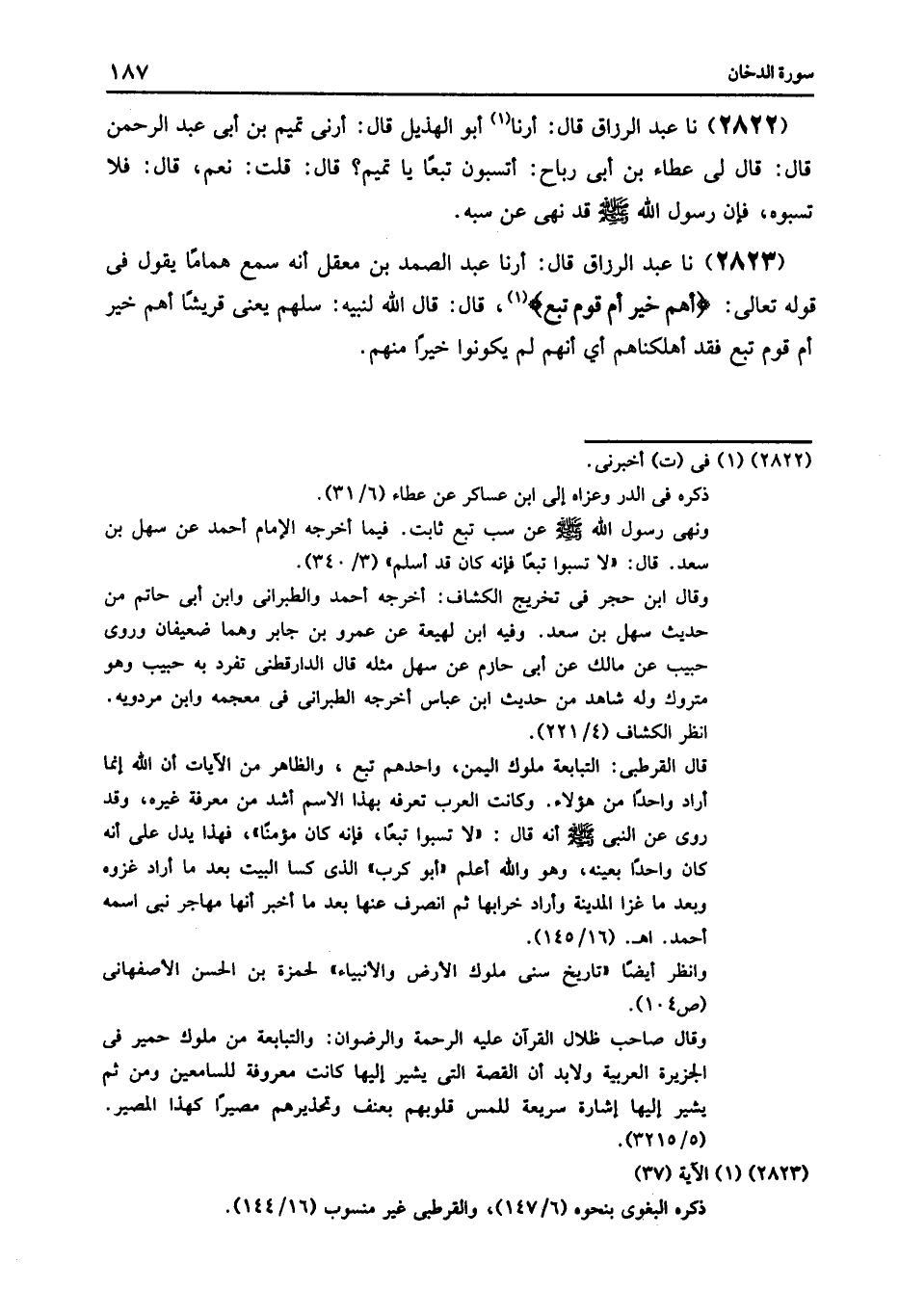 2823 - نا عَبْدُ الرَّزَّاقِ قَالَ: أرنا عَبْدُ الصمدِ بْنُ مَعْقِلٍ , أَنَّهُ سَمِعَ هَمَّامًا , يَقُولُ فِي قَوْلِهِ تَعَالَى: {أَهُمْ خَيْرٌ أَمْ قَوْمُ تُبَّعٍ} [الدخان: 37] قَالَ: قَالَ اللَّهُ لِنَبِيِّهِ: " §سَلْهُمْ يَعْنِي قُرَيْشًا أَهُمْ خَيْرٌ , أَمْ قَوْمُ تُبَّعٍ , فَقَدْ أَهْلَكْنَاهُمْ أَيْ: أَنَّهُمْ لَمْ يَكُونُوا خَيْرًا مِنْهُمْ "