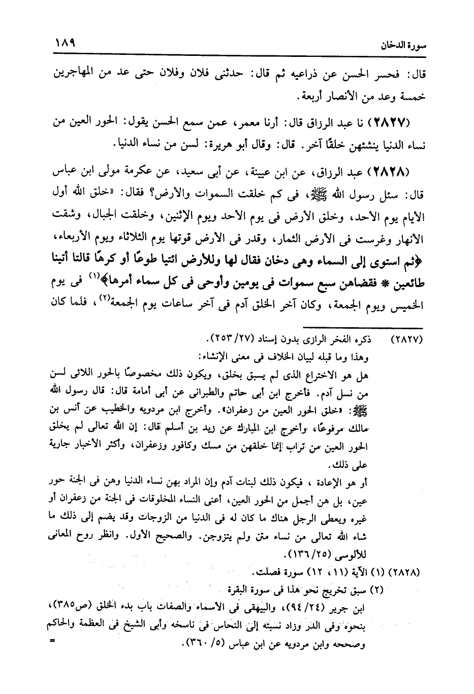 2828 - عَنِ ابْنِ عُيَيْنَةَ , عَنْ أَبِي سَعِيدٍ , عَنْ عِكْرِمَةَ مَوْلَى ابْنِ عَبَّاسٍ , قَالَ: سُئِلَ رَسُولُ اللَّهِ صَلَّى اللهُ عَلَيْهِ وَسَلَّمَ: فِي كَمْ خُلِقَتِ السَّمَوَاتُ وَالْأَرْضُ؟ فَقَالَ: " §خَلَقَ اللَّهُ أَوَّلَ الْأَيَّامِ يَوْمَ الْأَحَدِ , وَخَلَقَ الْأَرْضَ فِي يَوْمِ الْأَحَدِ , وَيَوْمَ الِاثْنَيْنِ , وَخُلِقَتِ الْجِبَالُ , وَشُقَّتِ الْأَنْهَارُ , وَغُرِسَتْ فِي الْأَرْضِ الثِّمَارُ وَقُدِّرَ فِي الْأَرْضٍ قُوتَهَا يَوْمَ الثُّلَاثَاءِ , وَيَوْمَ الْأَرْبِعَاءِ {ثُمَّ اسْتَوَى إِلَى السَّمَاءِ وَهَى دُخَانٌ فَقَالَ لَهَا وَلِلْأَرْضِ ائْتِيَا طَوْعًا أَوْ كَرْهًا , قَالَتَا أَتَيْنَا طَائِعِينَ فَقَضَاهُنَّ سَبْعَ سَمَوَاتٍ فِي يَوْمَيْنِ وَأَوْحَى فِي كُلِّ سَمَاءٍ أَمْرَهَا} فِي يَوْمِ الْخَمِيسِ وَيَوْمِ الْجُمُعَةِ , وَكَانَ آخِرُ الْخَلْقِ آدَمَ فِي آخِرِ سَاعَاتِ يَوْمِ الْجُمُعَةِ , فَلَمَّا كَانَ يَوْمُ السَّبْتِ , لَمْ يَكُنْ فِيهِ خَلْقٌ , فَقَالَتِ الْيَهُودُ فِيهِ مَا قَالَتْ فَأَنْزَلَ اللَّهُ تَكْذِيبَهُمْ {وَلَقَدْ خَلَقْنَا السَّمَوَاتِ وَالْأَرْضَ وَمَا بَيْنَهُمَا} إِلَى آخِرِ الْآيَةِ