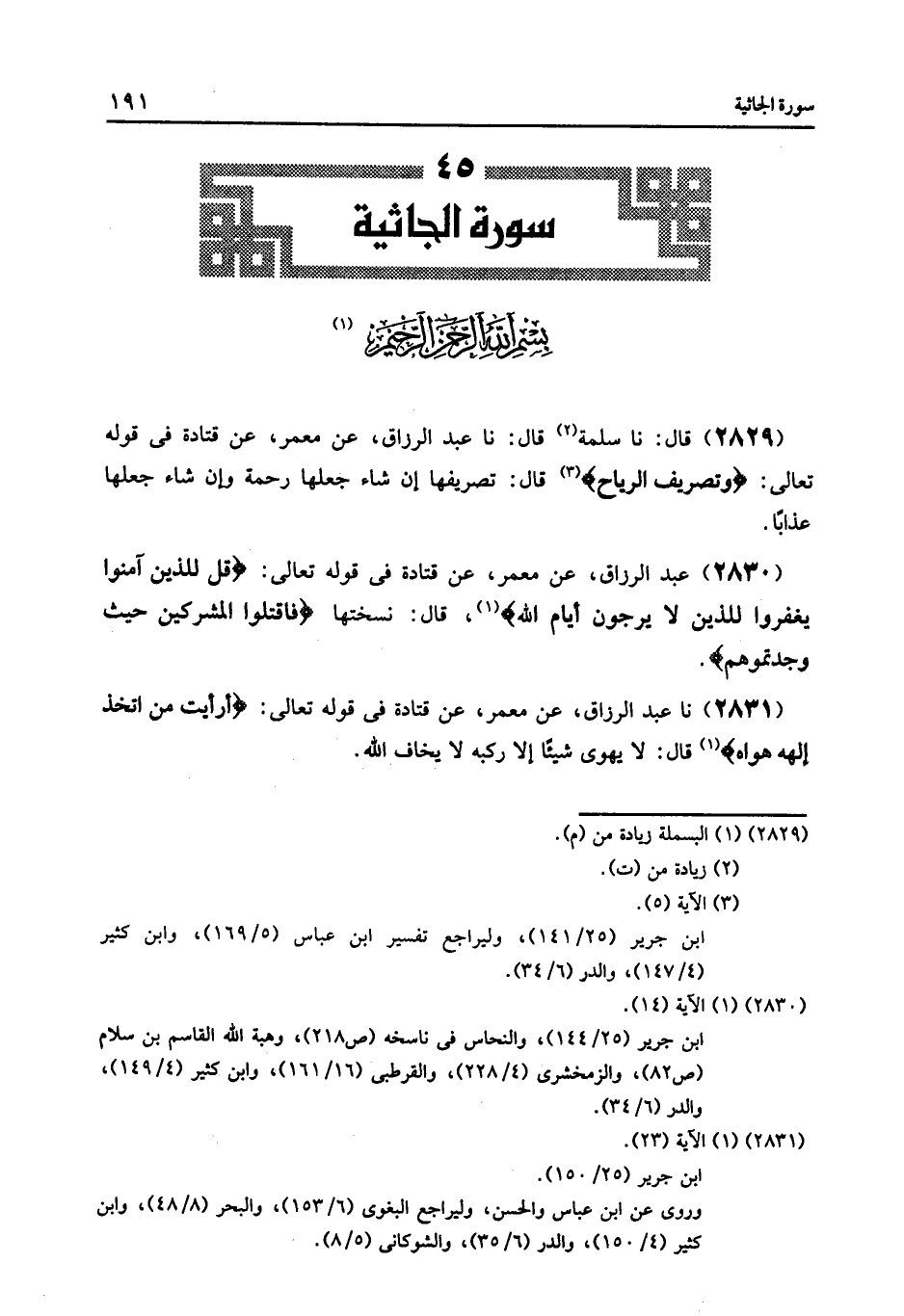 2830 - عَنْ مَعْمَرٍ , عَنْ قَتَادَةَ , فِي قَوْلِهِ تَعَالَى: {§قُلْ لِلَّذِينَ آمَنُوا يَغْفِرُوا لِلَّذِينَ لَا يَرْجُونَ أَيَّامَ اللَّهِ} [الجاثية: 14] قَالَ: " نَسَخَتْهَا {فَاقْتُلُوا الْمُشْرِكِينَ حَيْثُ وَجَدْتُمُوهُمْ} [التوبة: 5]