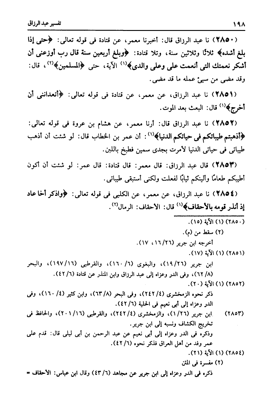 2850 - نا عَبْدُ الرَّزَّاقِ قَالَ: أَخْبَرَنَا مَعْمَرٌ , عَنْ قَتَادَةَ , فِي قَوْلِهِ تَعَالَى: {حَتَّى إِذَا بَلَغَ أَشُدَّهُ} [الأحقاف: 15] ثَلَاثًا وَثَلَاثِينَ سَنَةً , وَتَلَا قَتَادَةُ {وَبَلَغَ أَرْبَعِينَ سَنَةً قَالَ رَبِّ أَوْزِعْنِي أَنْ أَشْكُرَ نِعْمَتَكَ الَّتِي أَنْعَمْتَ عَلَيَّ وَعَلَى وَالِدَيَّ} [الأحقاف: 15] الْآيَةُ حَتَّى {الْمُسْلِمِينَ} [الأحقاف: 15] قَالَ: «§وَقَدْ مَضَى مِنْ سَيِّءِ عَمَلِهِ مَا قَدْ مَضَى»