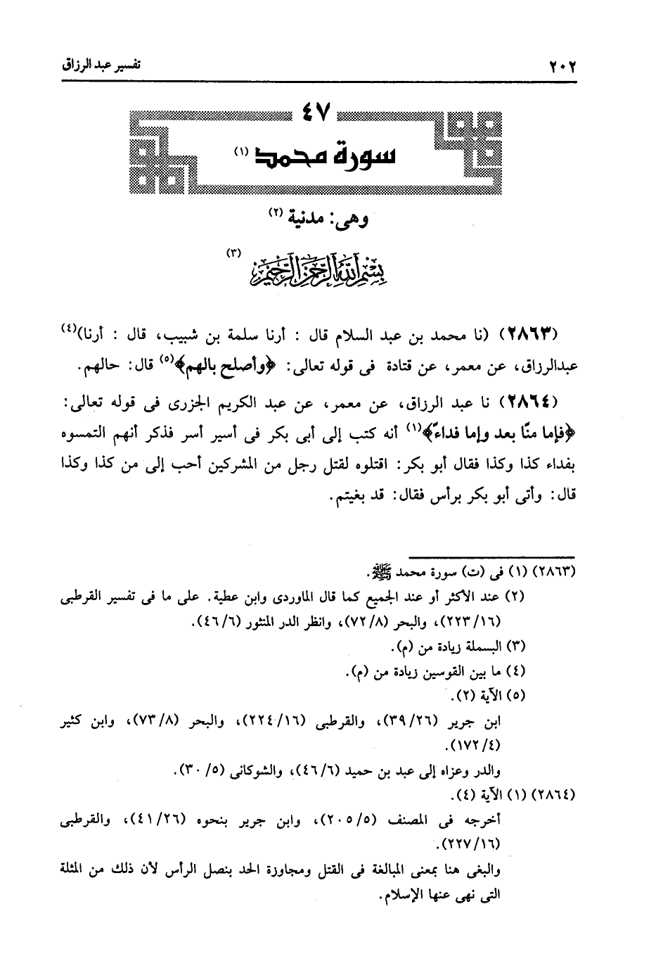 2864 - عَنْ مَعْمَرٍ , عَنْ عَبْدِ الْكَرِيمِ الْجَزَرِيِّ , فِي قَوْلِهِ تَعَالَى: {فَإِمَّا مَنًّا بَعْدُ وَإِمَّا فِدَاءً} [محمد: 4] أَنَّهُ كَتَبَ إِلَى أَبِي بَكْرٍ فِي أَسِيرٍ أُسِرَ , فَذَكَرَ أَنَّهُمُ الْتَمِسُوهُ بِفِدَاءِ كَذَا وَكَذَا فَقَالَ أَبُو بَكْرٍ: " §اقْتُلُوهُ لَقَتْلُ رَجُلٍ مِنَ الْمُشْرِكِينَ أَحَبُّ إِلَيَّ مِنْ كَذَا وَكَذَا , قَالَ: وَأُتِيَ أَبُو بَكْرٍ بِرَأْسٍ فَقَالَ: قَدْ بَغَيْتُمْ "