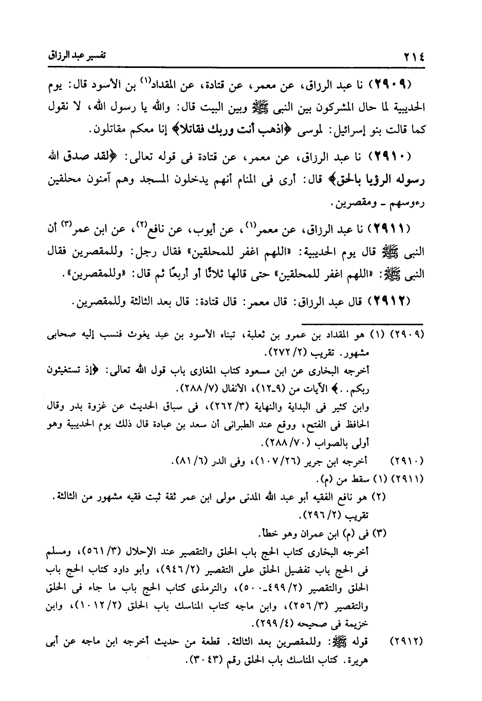 2910 - عَنْ مَعْمَرٍ , عَنْ قَتَادَةَ , فِي قَوْلِهِ تَعَالَى: {لَقَدْ صَدَقَ اللَّهُ رَسُولَهُ الرُؤْيَا بِالْحَقِّ} [الفتح: 27] قَالَ: «§أُرِيَ فِي الْمَنَامِ أَنَّهُمْ يَدْخُلُونَ الْمَسْجِدَ وَهُمْ آمِنُونَ مُحَلِّقِينَ رُءُوسَهُمْ وَمُقَصِّرِينَ»