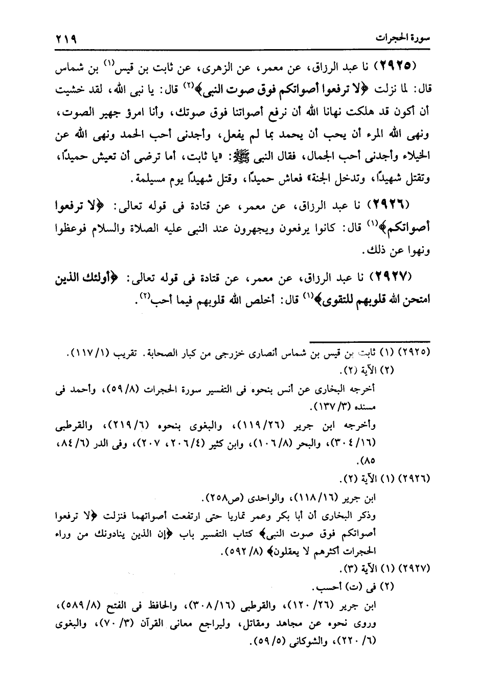 2926 - عَنْ مَعْمَرٍ , عَنْ قَتَادَةَ , فِي قَوْلِهِ تَعَالَى: {لَا تَرْفَعُوا أَصْوَاتَكُمْ} [الحجرات: 2] قَالَ: «§كَانُوا يَرْفَعُونَ وَيَجْهَرُونَ عِنْدَ النَّبِيِّ عَلَيْهِ الصَّلَاةُ وَالسَّلَامُ , فَوُعِظُوا وَنُهُوا عَنْ ذَلِكَ»