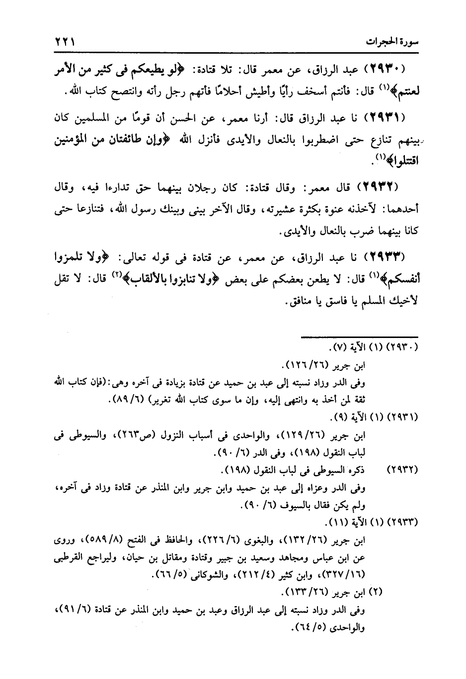 2933 - عَنْ مَعْمَرٍ , عَنْ قَتَادَةَ , فِي قَوْلِهِ تَعَالَى: {وَلَا تَلْمِزُوا أَنْفُسَكُمْ} [الحجرات: 11] قَالَ: لَا يَطْعُنْ بِعْضُكُمْ عَلَى بَعْضٍ {وَلَا تَنَابَزُوا بِالْأَلْقَابِ} [الحجرات: 11] قَالَ: «§لَا تَقُلْ لِأَخِيكَ الْمُسْلِمِ يَا فَاسِقُ يَا مُنَافِقُ»