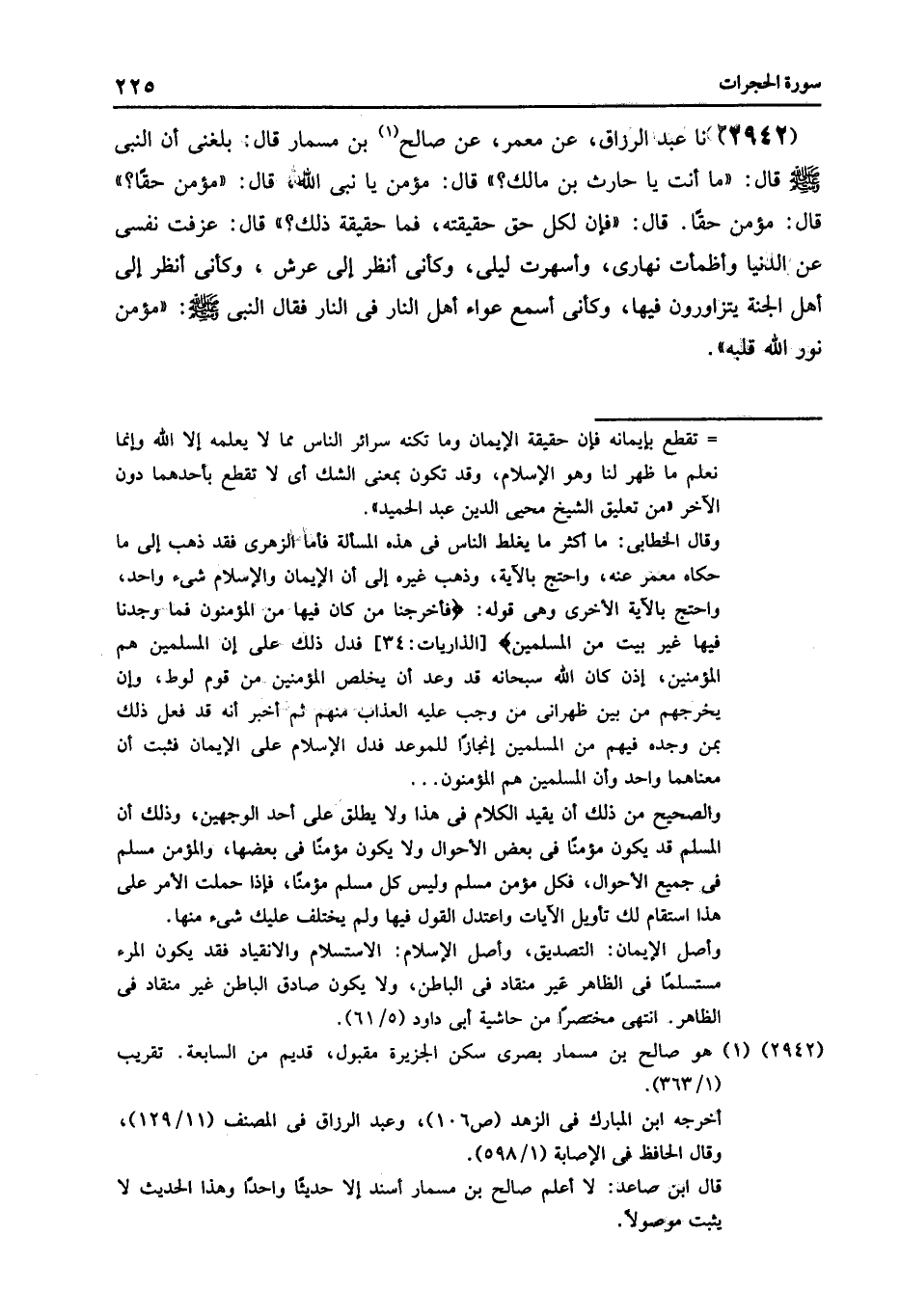 2942 - عَنْ مَعْمَرٍ , عَنْ صَالِحِ بْنِ مِسْمَارٍ , قَالَ: بَلَغَنِي أَنَّ النَّبِيَّ صَلَّى اللهُ عَلَيْهِ وَسَلَّمَ قَالَ: «مَا أَنْتَ يَا حَارِثَ بْنَ مَالِكٍ؟» قَالَ: مُؤْمِنٌ يَا نَبِيَّ اللَّهِ , قَالَ: «مُؤْمِنٌ حَقًّا؟» قَالَ: مُؤْمِنٌ حَقًّا , قَالَ: «فَإِنَّ لِكُلِّ حَقٍّ حَقِيقَتَهُ , فَمَا حَقِيقَةُ ذَلِكَ؟» قَالَ: عَزَفَتْ نَفْسِي عَنِ الدُّنْيَا , وَأَظْمَأْتُ نَهَارِي وَأَسْهَرْتُ لِيَلِي , وَكَأَنِّي أَنْظُرُ إِلَى الْعَرْشِ , وَكَأَنِّي أَنْظُرُ إِلَى أَهْلِ الْجَنَّةِ يَتَزَاوَرُونَ فِيهَا , وَكَأَنِّي أَسْمَعُ عُوَاءَ أَهْلِ النَّارِ فِي النَّارِ , فَقَالَ النَّبِيُّ صَلَّى اللهُ عَلَيْهِ وَسَلَّمَ: «§مُؤْمِنٌ نَوَّرَ اللَّهُ قَلْبَهُ»