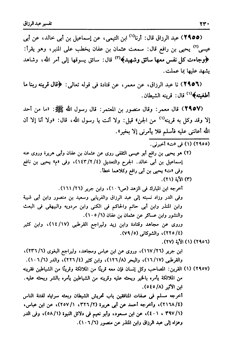 2955 - عَبْدُ الرَّزَّاقِ قَالَ: أرنا ابْنُ التَّيْمِيِّ , عَنْ إِسْمَاعِيلَ بْنِ أَبِي خَالِدٍ , عَنْ أَبِي عِيسَى يَحْيَى بْنِ رَافِعٍ قَالَ: سَمِعْتُ عُثْمَانَ بْنَ عَفَّانَ , يَخْطُبُ عَلَى الْمِنْبَرِ وَهُوَ يَقْرَأُ {وَجَاءَتْ كُلُّ نَفْسٍ مَعَهَا سَائِقٌ وَشَهِيدٌ} [ق: 21] قَالَ: «§سَائِقٌ يَسُوقُهَا إِلَى أَمْرِ اللَّهِ , وَشَاهِدٌ يَشْهَدُ عَلَيْهَا بِمَا عَمِلَتْ»