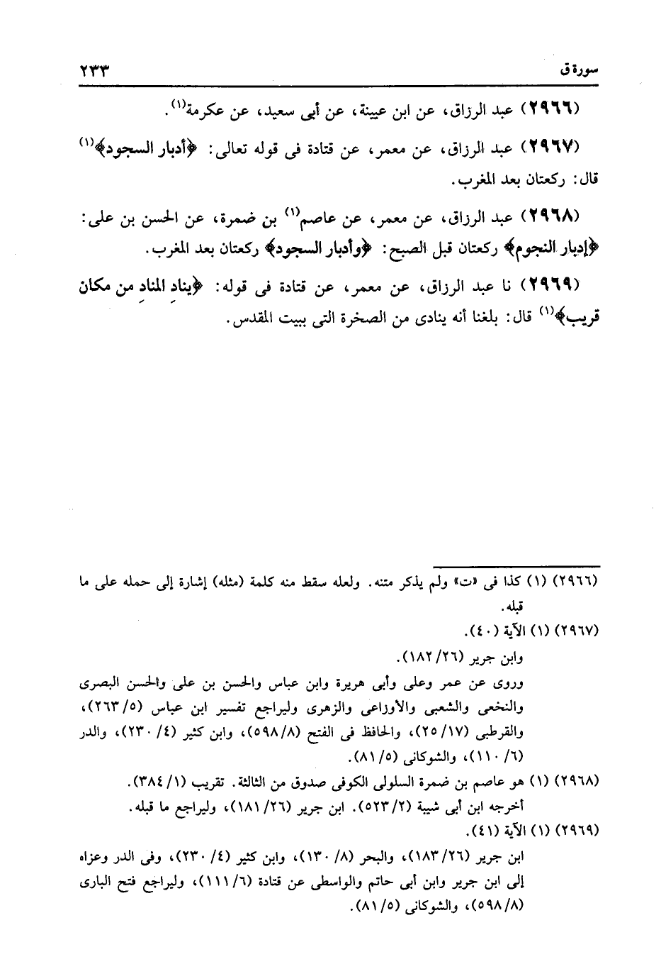 2967 - عَنْ مَعْمَرٍ , عَنْ قَتَادَةَ , فِي قَوْلِهِ تَعَالَى: {§وَأَدْبَارَ السُّجُودِ} [ق: 40] قَالَ: «رَكْعَتَانِ بَعْدَ الْمَغْرِبِ»