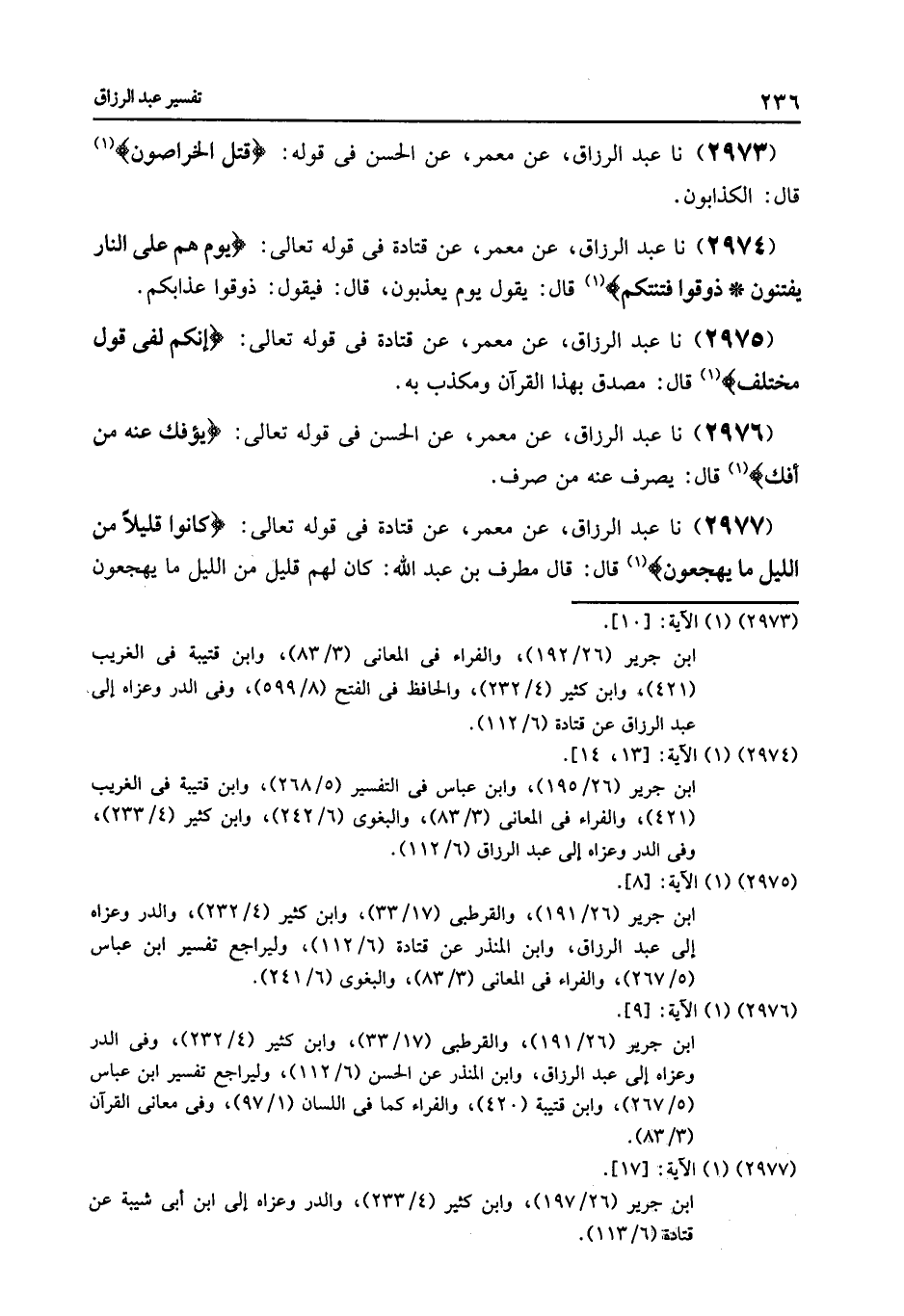 2977 - عَنْ مَعْمَرٍ , عَنْ قَتَادَةَ , فِي قَوْلِهِ تَعَالَى: {كَانُوا قَلِيلًا مِنَ اللَّيْلِ مَا يَهْجَعُونَ} [الذاريات: 17] قَالَ: قَالَ مُطَرِّفُ بْنُ عَبْدِ اللَّهِ: «كَانَ §لَهُمْ قَلِيلٌ مِنَ اللَّيْلِ , مَا يَهْجَعُونَ فِيهِ كَانُوا يُصَلُّونَهُ»