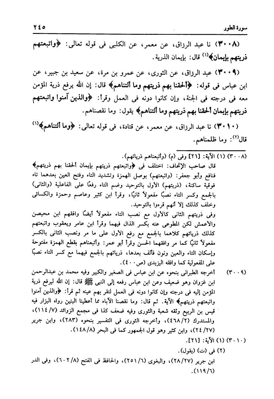 3009 - عَنِ الثَّوْرِيِّ , عَنْ عَمْرِو بْنِ مُرَّةَ , عَنْ سَعِيدِ بْنِ جُبَيْرٍ , عَنِ ابْنِ عَبَّاسٍ , فِي قَوْلِهِ تَعَالَى: {أَلْحَقْنَا بِهِمْ ذُرِّيَّتَهُمْ وَمَا أَلَتْنَاهُمْ} [الطور: 21] قَالَ: " إِنَّ §اللَّهَ يَرْفَعُ ذُرِّيَّةَ الْمُؤْمِنِ مَعَهُ فِي دَرَجَتِهِ فِي الْجَنَّةِ , وَإِنْ كَانُوا دُونَهُ فِي الْعَمَلِ , وَقَرَأَ {وَالَّذِينَ آمَنُوا وَاتَّبَعَتْهُمْ ذُرِّيَّتُهُمْ بِإِيمَانٍ أَلْحَقْنَا بِهِمْ ذُرِّيَّتَهُمْ وَمَا أَلَتْنَاهُمْ} [الطور: 21] يَقُولُ: وَمَا نَقَصْنَاهُمْ "