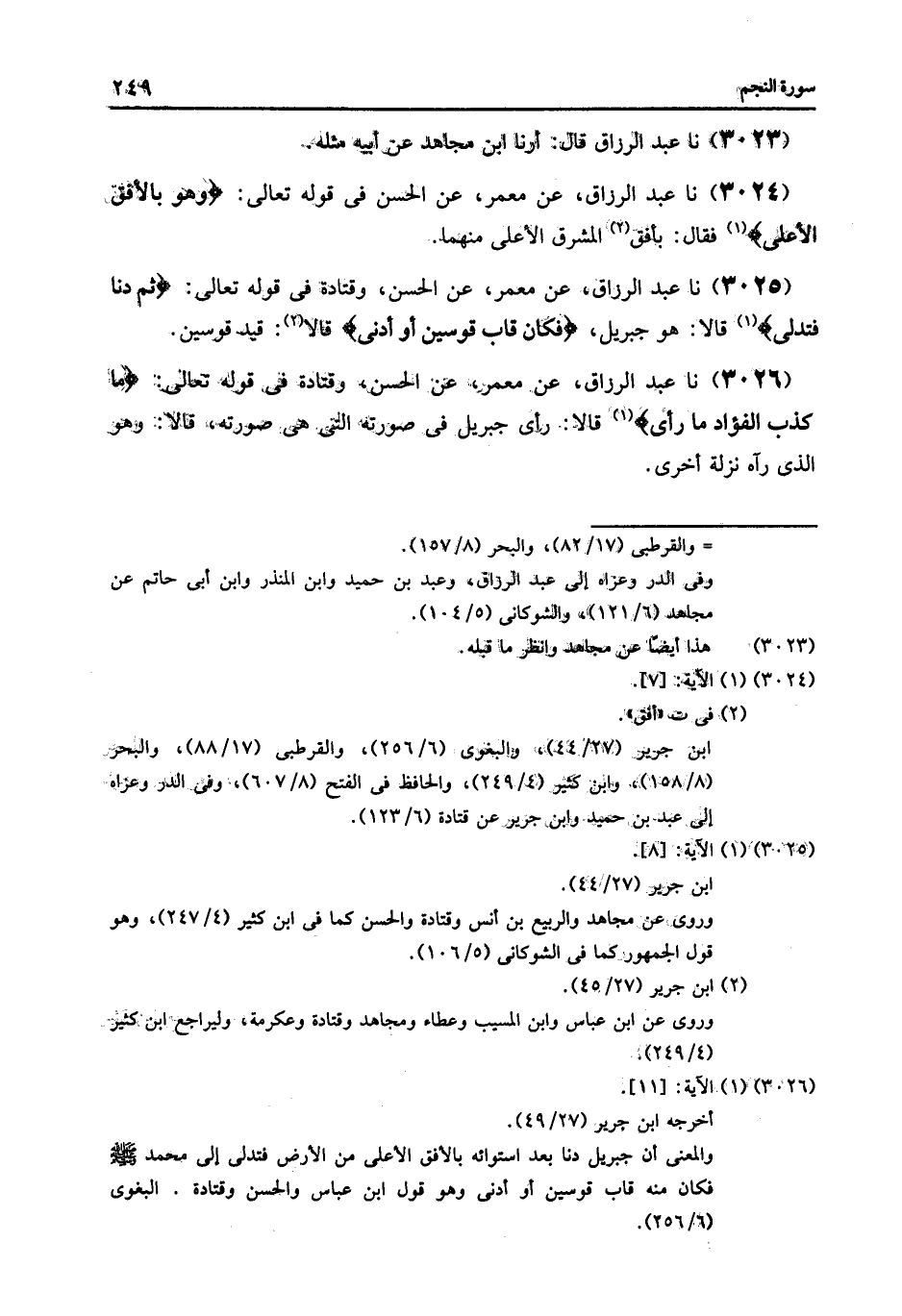 3025 - عَنْ مَعْمَرٍ , عَنِ الْحَسَنِ , وَقَتَادَةَ , فِي قَوْلِهِ تَعَالَى: {ثُمَّ دَنَا فَتَدَلَّى} [النجم: 8] قَالَا: هُوَ جِبْرِيلُ: {§فَكَانَ قَابَ قَوْسَيْنِ أَوْ أَدْنَى} [النجم: 9] قَالَا: «قِيدَ قَوْسَيْنِ»