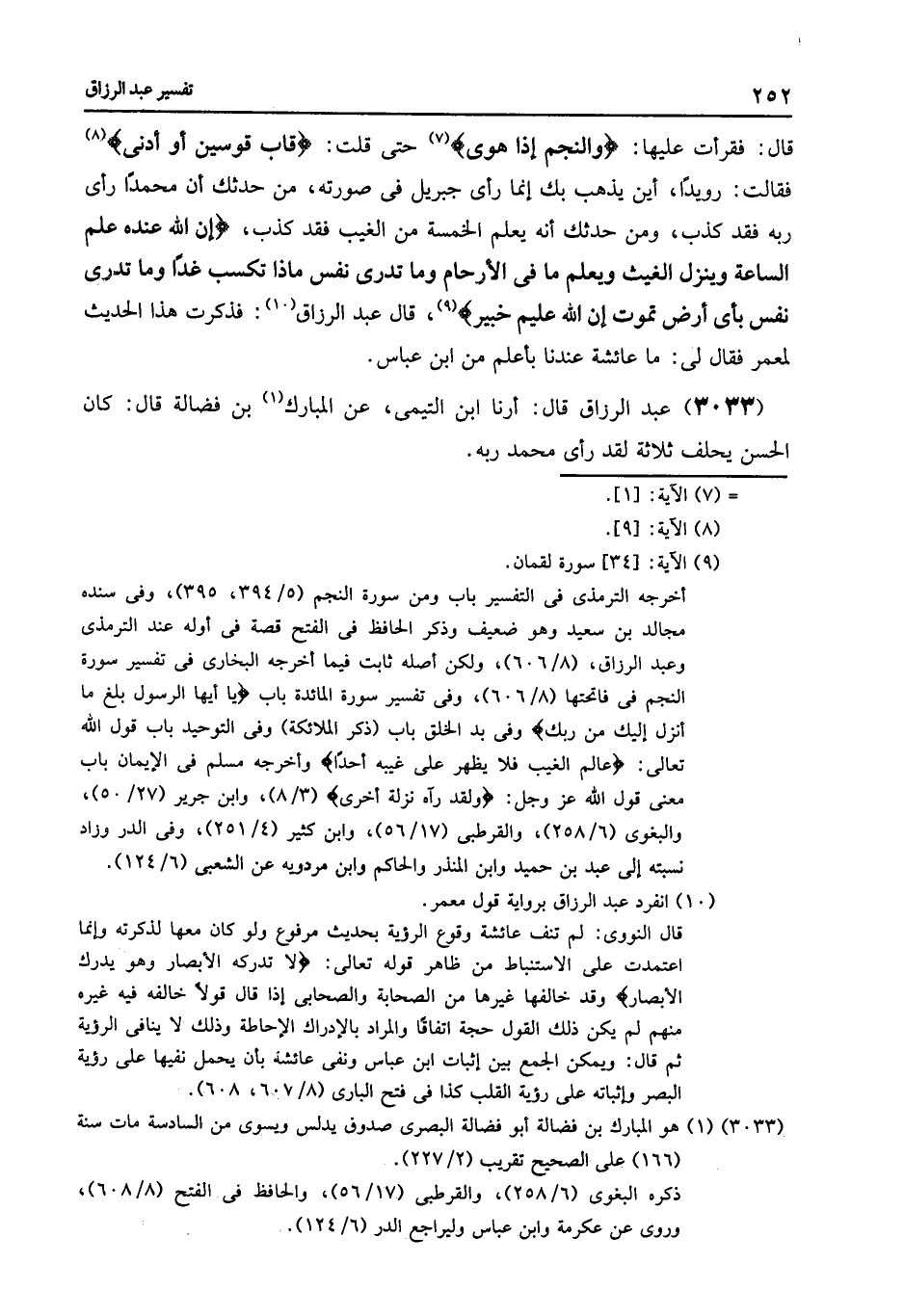 3035 - عَنْ مَعْمَرٍ , عَنْ قَتَادَةَ فِي قَوْلِهِ تَعَالَى: {لَقَدْ رَأَى مِنْ آيَاتِ رَبِّهِ الْكُبْرَى} [النجم: 18] قَالَ ابْنُ مَسْعُودٍ قَالَ: «§رَأَى النَّبِيُّ رَفْرَفًا أَخْضَرَ , مِنَ الْجَنَّةِ قَدْ سَدَّ الْأُفُقَ»