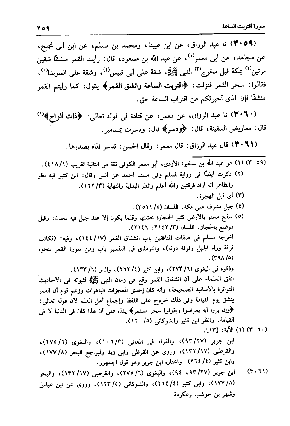 3059 - عَنِ ابْنِ عُيَيْنَةَ , وَمُحَمَّدِ بْنِ مُسْلِمٍ , عَنِ ابْنِ أَبِي نَجِيحٍ , عَنْ مُجَاهِدٍ , عَنْ أَبِي مَعْمَرٍ , عَنْ عَبْدِ اللَّهِ بْنِ مَسْعُودٍ , قَالَ: رَأَيْتُ الْقَمَرَ مُنْشَقًّا شِقَّيْنِ مَرَّتَيْنِ بِمَكَّةَ قَبْلَ مَخْرَجِ النَّبِيِّ صَلَّى اللهُ عَلَيْهِ وَسَلَّمَ , شِقَّةٌ عَلَى أَبِي قُبَيْسٍ , وَشِقَّةٌ عَلَى السُّوَيْدَا , فَقَالُوا: سُحِرَ الْقَمَرُ , فَنَزَلَتِ {اقْتَرَبَتِ السَّاعَةُ وَانْشَقَّ} [القمر: 1] الْقَمَرُ يَقُولُ: «§كَمَا رَأَيْتُمُ الْقَمَرَ مُنْشَقًّا , فَإِنَّ الَّذِي أَخْبَرْتُكُمْ عَنِ اقْتِرَابِ السَّاعَةِ حَقٌّ»