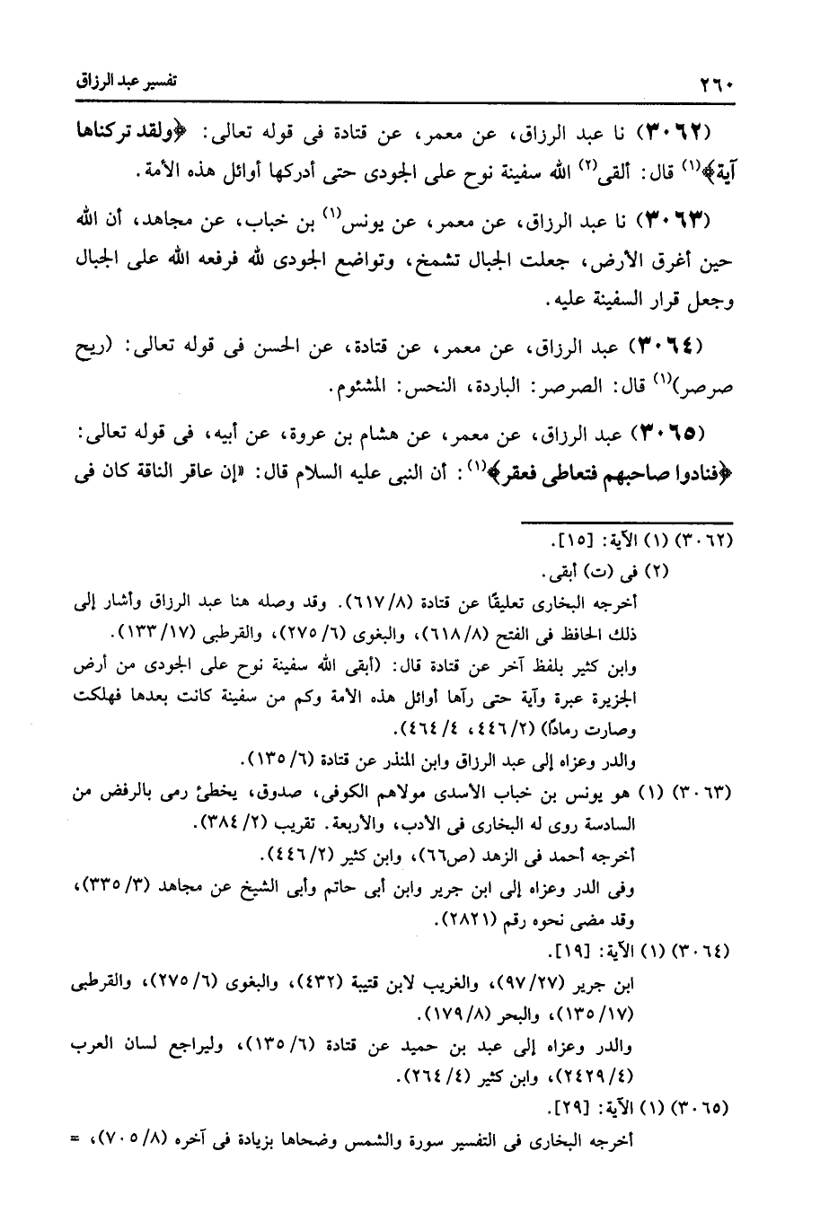 3062 - عَنْ مَعْمَرٍ , عَنْ قَتَادَةَ , فِي قَوْلِهِ تَعَالَى: {وَلَقَدْ تَرَكْنَاهَا آيَةً} [القمر: 15] قَالَ: «§أَبْقَى اللَّهُ سَفِينَةَ نُوحٍ عَلَى الْجُودِيِّ , حَتَّى أَدْرَكَهَا أَوَائِلُ هَذِهِ الْأُمَّةِ»