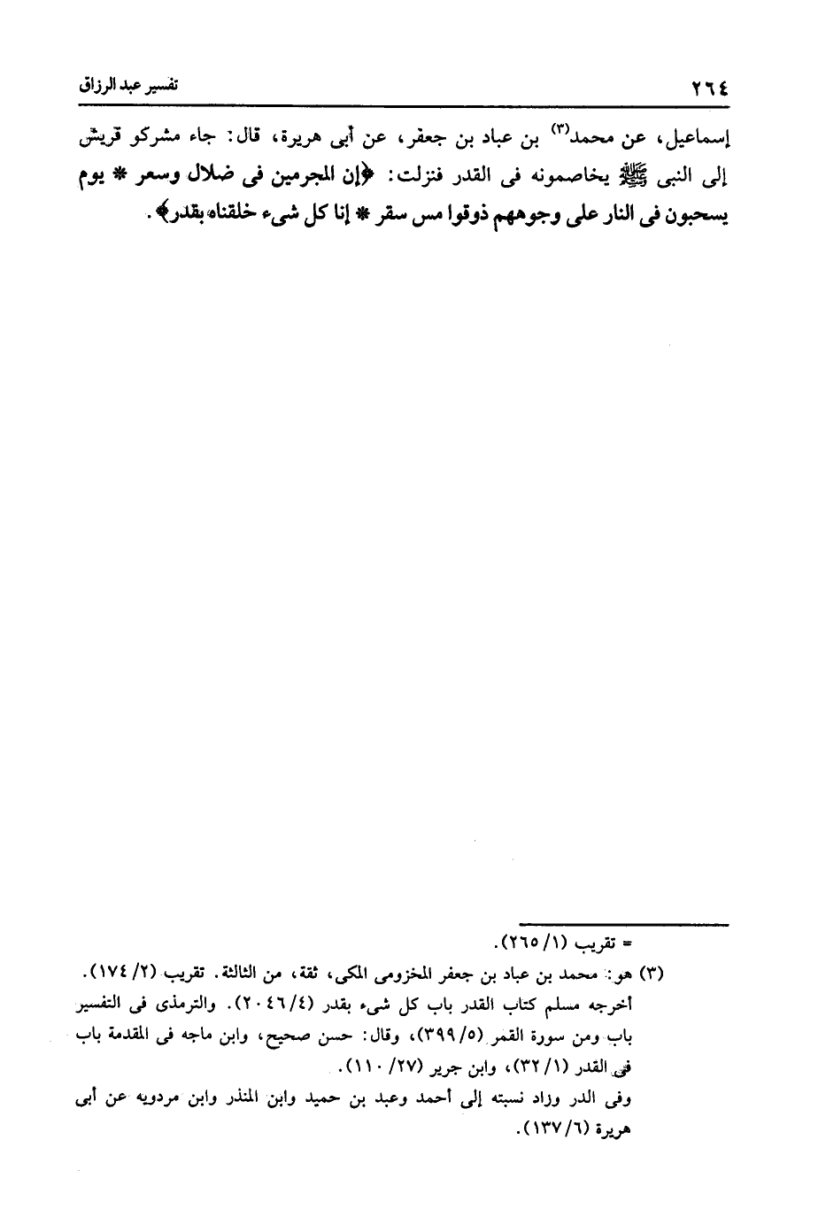 3074 - عَنْ مُحَمَّدِ بْنِ يَحْيَى , عَنِ الثَّوْرِيِّ , عَنْ زِيَادِ بْنِ إِسْمَاعِيلَ , عَنْ مُحَمَّدِ بْنِ عَبَّادِ بْنِ جَعْفَرٍ , عَنْ أَبِي هُرَيْرَةَ قَالَ: " جَاءَ مُشْرِكُو قُرَيْشٍ إِلَى النَّبِيِّ صَلَّى اللهُ عَلَيْهِ وَسَلَّمَ , يُخَاصِمُونَهُ فِي الْقَدَرِ , فَنَزَلَتْ: {§إِنَّ الْمُجْرِمِينَ فِي ضَلَالٍ وَسُعُرٍ يَوْمَ يُسْحَبُونَ فِي النَّارِ عَلَى وُجُوهِهِمْ , ذُوقُوا مَسَّ سَقَرَ إِنَّا كُلَّ شَيْءٍ خَلَقْنَاهُ بِقَدَرٍ} [القمر: 48]