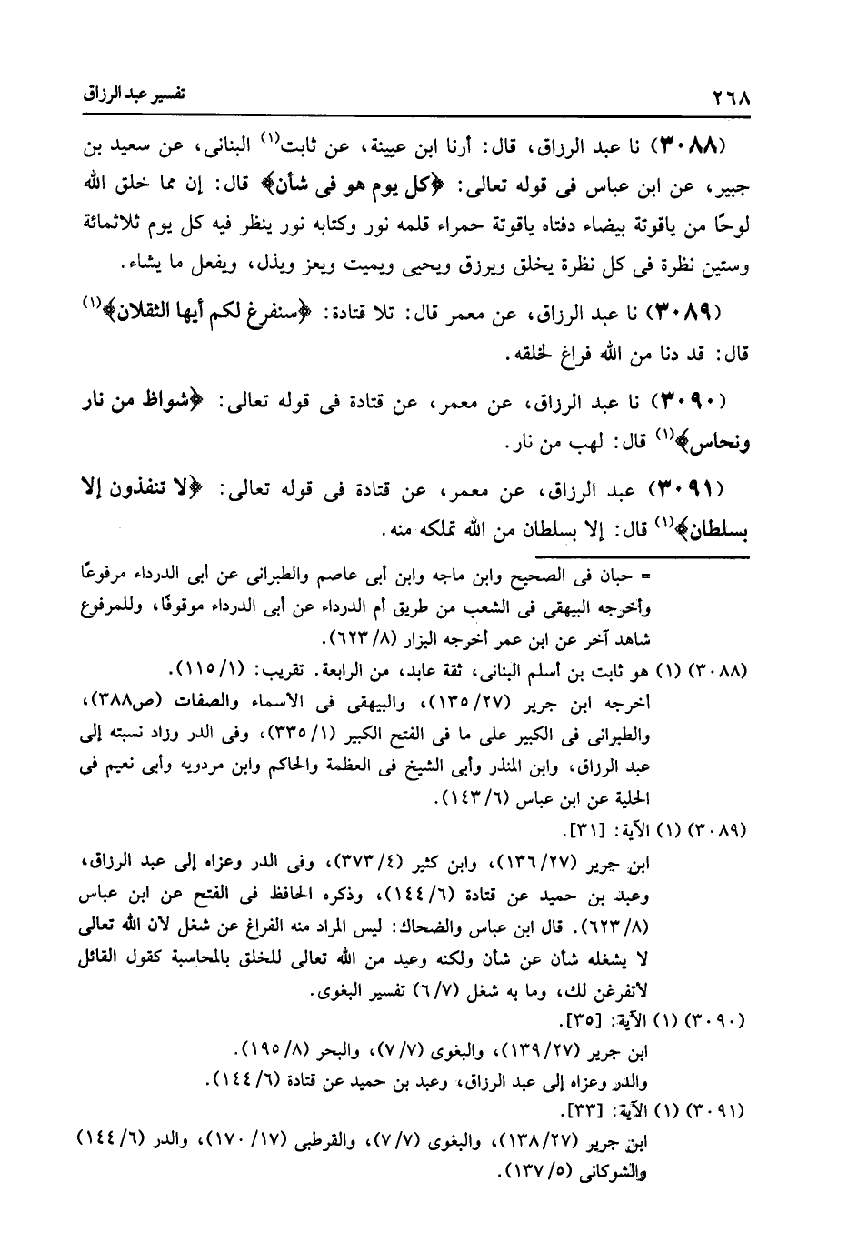 3091 - عَنْ مَعْمَرٍ , عَنْ قَتَادَةَ , فِي قَوْلِهِ تَعَالَى: {لَا تَنْفُذُونَ إِلَّا بِسُلْطَانِ} [الرحمن: 33] قَالَ: «§إِلَّا بِسُلْطَانٍ مِنَ اللَّهِ تَمْلِكُهُ مِنْهُ»