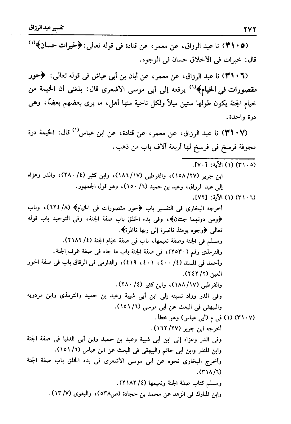 3107 - عَنْ مَعْمَرٍ , عَنْ قَتَادَةَ , عَنِ ابْنِ عَبَّاسٍ , قَالَ: «§الْخَيْمَةُ دُرَّةٌ مُجَوَّفَةٌ فَرْسَخٌ فِي فَرْسَخٍ , لَهَا أَرْبَعَةُ آلَافِ بَابٍ مِنْ ذَهَبٍ»