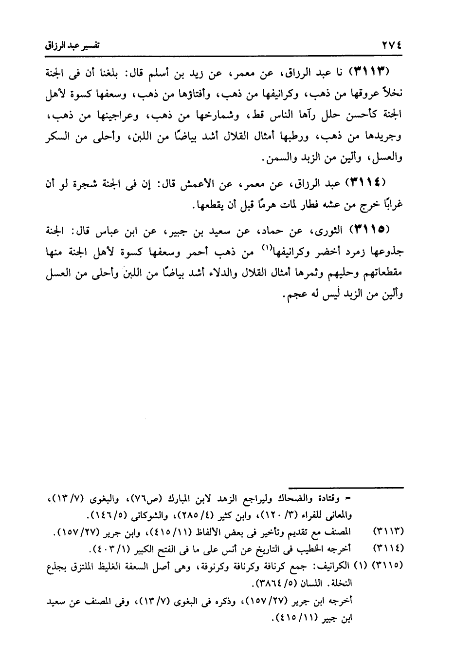 3115 - الثَّوْرِيُّ , عَنْ حَمَّادٍ , عَنْ سَعِيدِ بْنِ جُبَيْرٍ , عَنِ ابْنِ عَبَّاسٍ , قَالَ: «§الْجَنَّةُ جُذُوعُهَا زُمُرُّدٌ أَخْضَرُ , وَكَرَانِيفُهَا مِنْ ذَهَبٍ أَحْمَرَ , وَسَعَفُهَا كِسْوَةٌ لِأَهْلِ الْجَنَّةِ مِنْهَا مُقَطَّعَاتُهُمْ , وَحُلِيُّهُمْ وَثَمَرُهَا أَمْثَالُ الْقِلَالِ , وَالدِّلَاءُ أَشَدُّ بَيَاضًا مِنَ اللَّبَنِ , وَأَحْلَى مِنَ الْعَسَلِ , وَأَلْيَنُ مِنَ الزُّبْدِ لَيْسَ لَهُ عَجَمٌ»