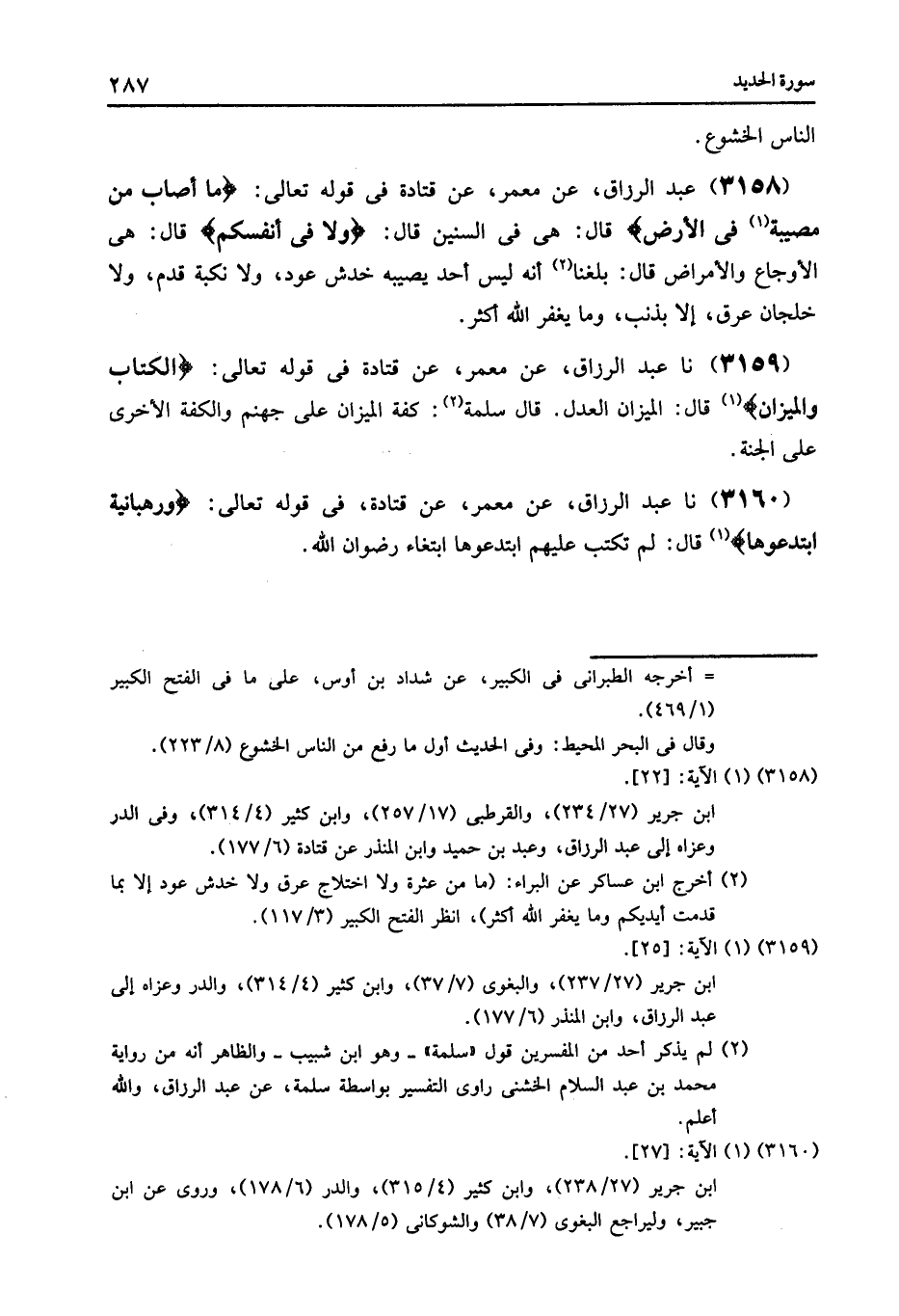 3159 - عَنْ مَعْمَرٍ , عَنْ قَتَادَةَ , فِي قَوْلِهِ تَعَالَى: {الْكِتَابَ وَالْمِيزَانَ} [الحديد: 25] قَالَ: الْمِيزَانُ: الْعَدْلُ , قَالَ سَلَمَةُ: «§كِفَّةُ الْمِيزَانِ عَلَى جَهَنَّمَ , وَالْكِفَّةُ الْأُخْرَى عَلَى الْجَنَّةِ»