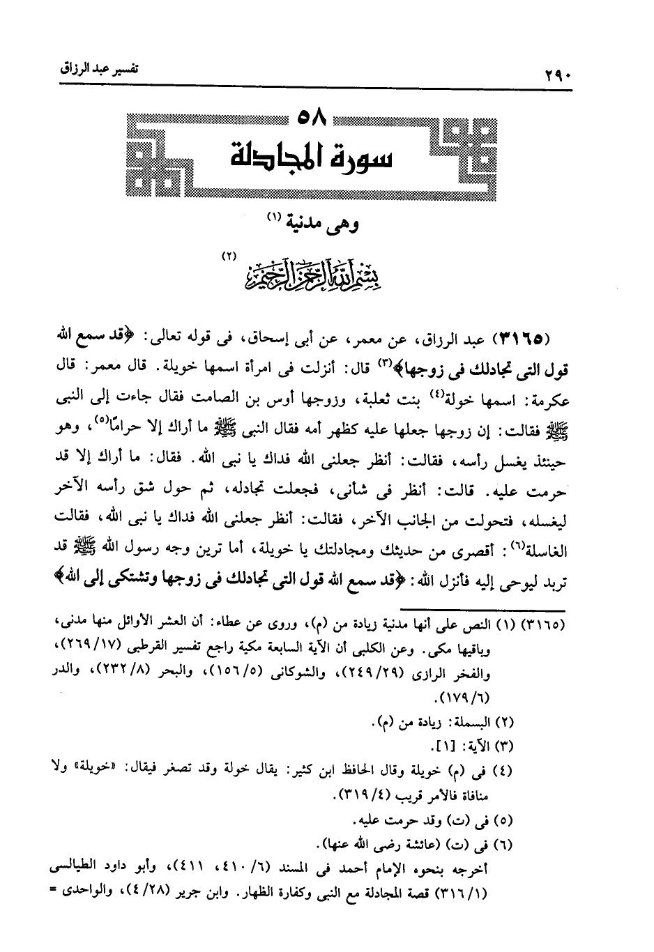 3165 - عَنْ مَعْمَرٍ , عَنْ أَبِي إِسْحَاقَ , فِي قَوْلِهِ تَعَالَى: {قَدْ سَمِعَ اللَّهُ قَوْلَ الَّتِي تُجَادِلُكَ فِي زَوْجِهَا} [المجادلة: 1] قَالَ: أُنْزِلَتْ فِي امْرَأَةٍ اسْمُهَا خُوَيْلَةُ , قَالَ مَعْمَرٌ: قَالَ عِكْرِمَةُ: اسْمُهَا خَوْلَةُ بِنْتُ ثَعْلَبَةَ وَزَوْجُهَا أَوْسُ بْنُ الصَّامِتِ , فَقَالَ: جَاءَتْ إِلَى النَّبِيِّ صَلَّى اللهُ عَلَيْهِ وَسَلَّمَ , فَقَالَتْ: إِنَّ زَوْجَهَا جَعَلَهَا عَلَيْهِ كَظَهْرِ أُمِّهِ , فَقَالَ النَّبِيُّ صَلَّى اللهُ عَلَيْهِ وَسَلَّمَ: «مَا أَرَاكِ إِلَّا وَقَدْ حُرِّمْتِ عَلَيْهِ , وَهُوَ حِينَئِذٍ يَغْسِلُ رَأْسَهُ» فَقَالَتِ: انْظُرْ جَعَلَنِي اللَّهُ فِدَاكَ يَا نَبِيَّ اللَّهِ , فقَالَ: «مَا أَرَاكِ إِلَّا قَدْ حُرِّمْتِ عَلَيْهِ» قَالَتِ: انْظُرْ فِي شَأْنِي , فَجَعَلَتْ تُجَادِلُهُ , ثُمَّ حَوَّلَ شِقَّ رَأْسِهِ الْآخَرِ لِيَغْسِلَهُ فَتَحَوَّلَتْ مِنَ الْجَانِبِ الْآخَرِ , فَقَالَتِ: انْظُرْ جَعَلَنِي اللَّهُ فِدَاكَ يَا نَبِيَّ اللَّهِ , فَقَالَتِ الْغَاسِلَةُ: " §أَقْصِرِي مِنْ حَدِيثِكِ , وَمُجَادَلَتِكِ يَا خُوَيْلَةُ , أَمَا تَرَيْنَ وَجْهَ رَسُولِ اللَّهِ صَلَّى اللهُ عَلَيْهِ وَسَلَّمَ , قَدْ تَرَبَّدَ لِيُوحَى إِلَيْهِ , فَأَنْزَلَ اللَّهُ: {قَدْ سَمِعَ اللَّهَ قَوْلَ الَّتِي تُجَادِلُكَ فِي زَوْجِهَا وَتَشْتَكِي إِلَى اللَّهِ} [المجادلة: 1] حَتَّى بَلَغَ {ثُمَّ يَعُودُونَ لِمَا قَالُوا} [المجادلة: 3] قَالَ قَتَادَةُ: حَرَّمَهَا , ثُمَّ يُرِيدُ أَنْ يَعُودَ لَهَا يَطَؤُهَا {فَتَحْرِيرُ رَقَبَةٍ مِنْ قَبْلِ أَنْ يَتَمَاسَّا} [المجادلة: 3] حَتَّى بَلَغَ {بِمَا تَعْمَلُونَ خَبِيرٌ} [المجادلة: 3]