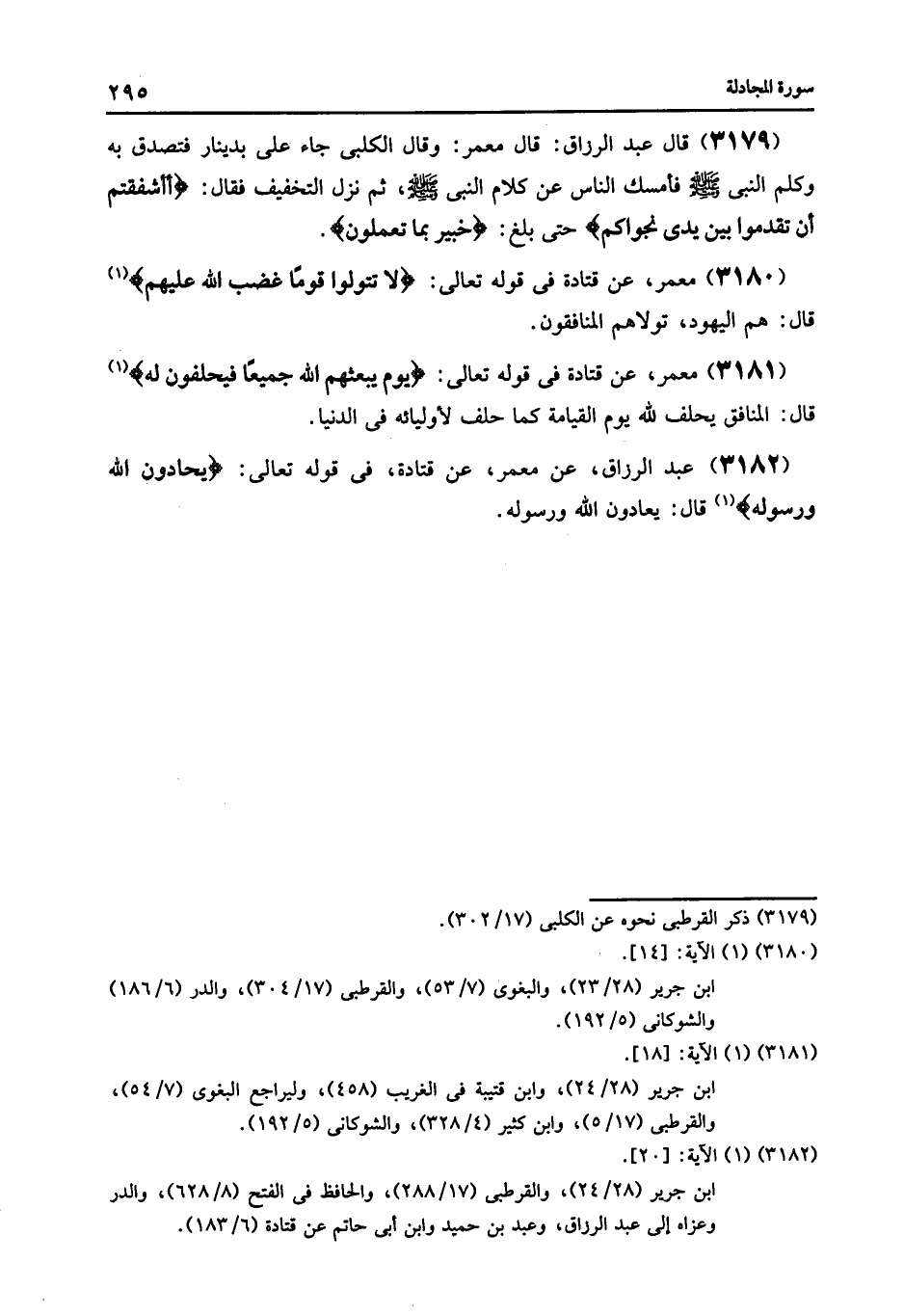3182 - عَنْ مَعْمَرٍ , عَنْ قَتَادَةَ , فِي قَوْلِهِ تَعَالَى: {يُحَادُّونَ اللَّهَ وَرَسُولَهُ} [المجادلة: 20] قَالَ: «§يُعَادُونَ اللَّهَ وَرَسُولَهُ»