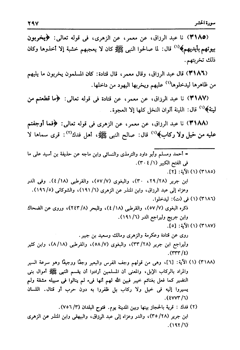 3188 - عَنْ مَعْمَرٍ , عَنِ الزُّهْرِيِّ , فِي قَوْلِهِ تَعَالَى: {فَمَا أَوْجَفْتُمْ عَلَيْهِ مِنْ خَيْلٍ وَلَا رِكَابٍ} [الحشر: 6] قَالَ: صَالِحَ النَّبِيُّ صَلَّى اللهُ عَلَيْهِ وَسَلَّمَ , أَهْلَ فَدَكٍ , قُرًى سَمَّاهَا لَا أَحْفَظُهَا وَهُوَ مُحَاصِرٌ قَوْمًا آخَرِينَ , فَأَرْسَلُوا إِلَيْهِ بِالصُّلْحِ فَأَفَاءَهَا اللَّهُ عَلَيْهِمْ مِنْ غَيْرِ قِتَالٍ , لَمْ يُوجِفُوا عَلَيْهَا خَيْلًا وَلَا رِكَابًا , قَالَ اللَّهُ تَعَالَى: {§فَمَا أَوْجَفْتُمْ عَلَيْهِ مِنْ خَيْلٍ , وَلَا رِكَابٍ} [الحشر: 6] يَقُولُ: «بِغَيْرِ قِتَالٍ»