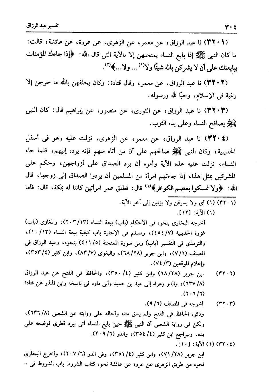 3204 - عَنْ مَعْمَرٍ , عَنِ الزُّهْرِيِّ: نَزَلَتْ عَلَيْهِ , وَهُوَ فِي أَسْفَلِ الْحُدَيْبِيَةِ وَكَانَ النَّبِيُّ صَلَّى اللهُ عَلَيْهِ وَسَلَّمَ , صَالَحَهُمْ عَلَى أَنَّ مَنْ أَتَاهُ مِنْهُمْ فَإِنَّهُ يَرُدُّهُ إِلَيْهِمْ , فَلَمَّا جَاءَ النِّسَاءُ نَزَلَتْ عَلَيْهِ هَذِهِ الْآيَةُ , وَأَمَرَهُ أَنْ يَرُدَّ الصَّدَاقَ عَلَى أَزْوَاجِهِنَّ , وَحَكَمَ عَلَى الْمُشْرِكِينَ بِمِثْلِ هَذَا إِذَا جَاءَتْهُمُ امْرَأَةٌ مِنَ الْمُسْلِمِينَ أَنْ يَرُدُّوا الصَّدَاقَ إِلَى زَوْجِهَا , قَالَ اللَّهُ: {§وَلَا تُمْسِكُوا بِعِصَمِ الْكَوَافِرِ} [الممتحنة: 10] قَالَ: فَطَلَّقَ عُمَرُ امْرَأَتَيْنِ كَانَتَا لَهُ بِمَكَّةَ , قَالَ: فَأَمَّا الْمُؤْمِنُونَ فَأَقَرُّوا بِحُكْمِ اللَّهِ , وَأَمَّا الْمُشْرِكُونَ فَأَبَوْا أَنْ يُقِرُّوا , فَأَنْزَلَ اللَّهُ: {وَإِنْ فَاتَكُمْ شَيْءٌ مِنْ أَزْوَاجِكُمْ إِلَى الْكُفَّارِ فَعَاقَبْتُمْ فَآتُوا الَّذِينَ ذَهَبَتْ أَزْوَاجُهُمْ مِثْلَ مَا أَنْفَقُوا} [الممتحنة: 11] فَأَمَرَ اللَّهُ الْمُؤْمِنِينَ أَنْ يُؤَدُّوا الصَّدَاقَ إِذَا ذَهَبَتِ امْرَأَةٌ مِنَ الْمُسْلِمِينَ , وَلَهَا زَوْجٌ مِنَ الْمُسْلِمِينَ , أَنْ يُؤَدِّي إِلَيْهِ الْمُسْلِمُونَ صَدَاقَ امْرَأَتِهِ مِنْ صَدَاقٍ إِنْ كَانَ فِي أَيْدِيهِمْ مِمَّا يُرِيدُونَ أَنْ يَرُدُّوا ذَلِكَ إِلَى الْمُشْرِكِينَ "