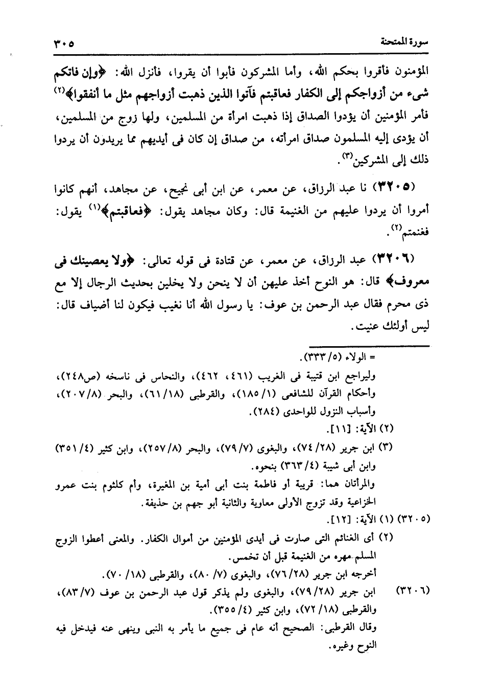 3205 - عَنْ مَعْمَرٍ , عَنِ ابْنِ أَبِي نَجِيحٍ , عَنْ مُجَاهِدٍ , أَنَّهُمْ كَانُوا أُمِرُوا أَنْ يَرُدُّوا , عَلَيْهِمْ مِنَ الْغَنِيمَةَ , قَالَ: وَكَانَ مُجَاهِدٌ يَقُولُ: {§فَعَاقَبْتُمْ} [الممتحنة: 11] يَقُولُ: «فَغَنِمْتُمْ»