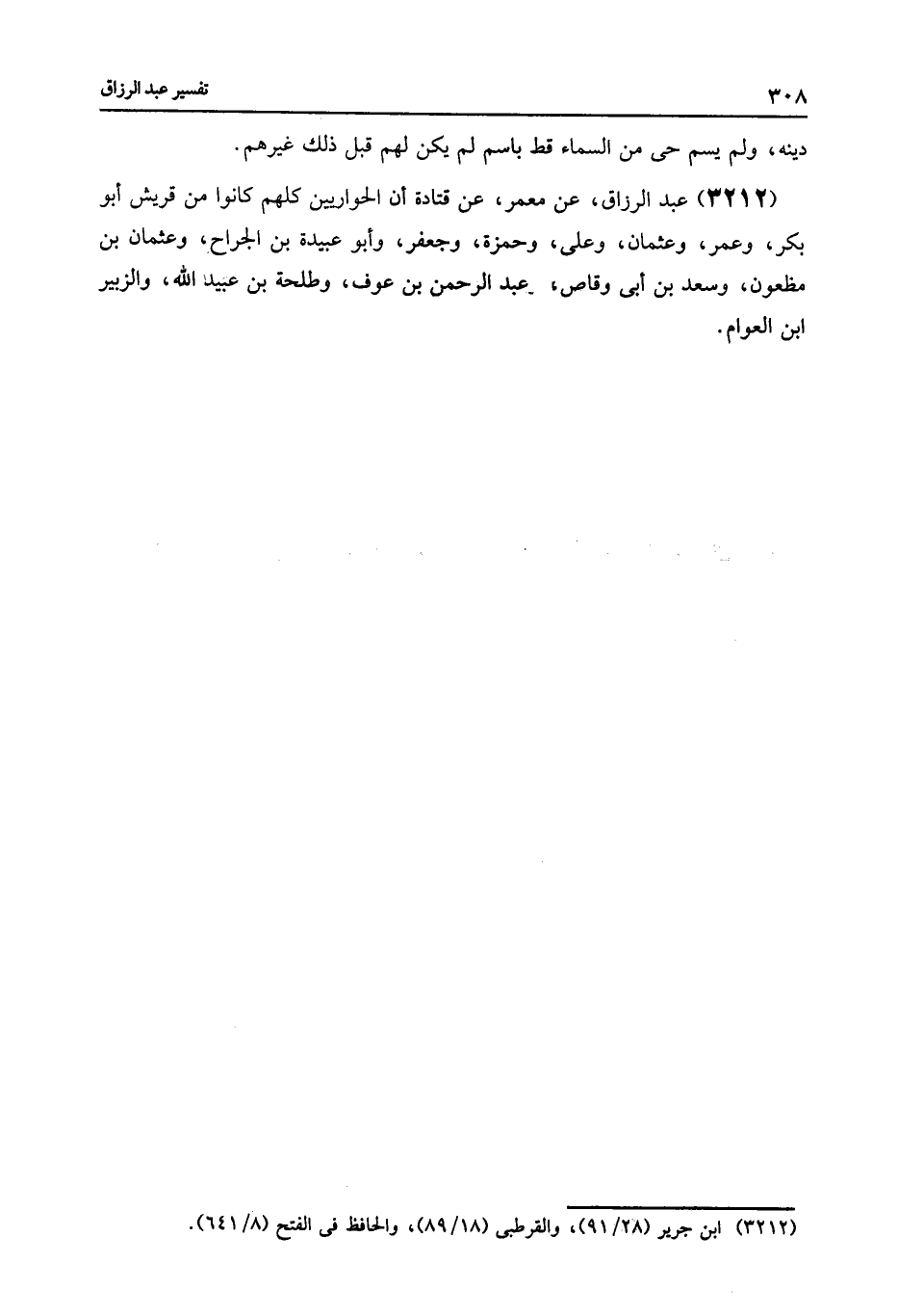 3212 - عَنْ مَعْمَرٍ , عَنْ قَتَادَةَ: " أَنَّ §الْحَوَارِيِّينَ كُلَّهُمْ مِنْ قُرَيْشٍ: أَبُو بَكْرٍ , وَعُمَرُ , وَعُثْمَانُ , وَعَلِيٌّ , وَحَمْزَةُ , وَجَعْفَرٌ , وَأَبُو عُبَيْدَةَ بْنُ الْجَرَّاحِ , وَعُثْمَانُ بْنُ مَظْعُونٍ , وَسَعْدُ بْنُ أَبِي وَقَّاصٍ , وَعَبْدُ الرَّحْمَنِ بْنُ عَوْفٍ , وَطَلْحَةُ بْنُ عُبَيْدِ اللَّهِ , وَالزُّبَيْرُ بْنُ الْعَوَّامِ "