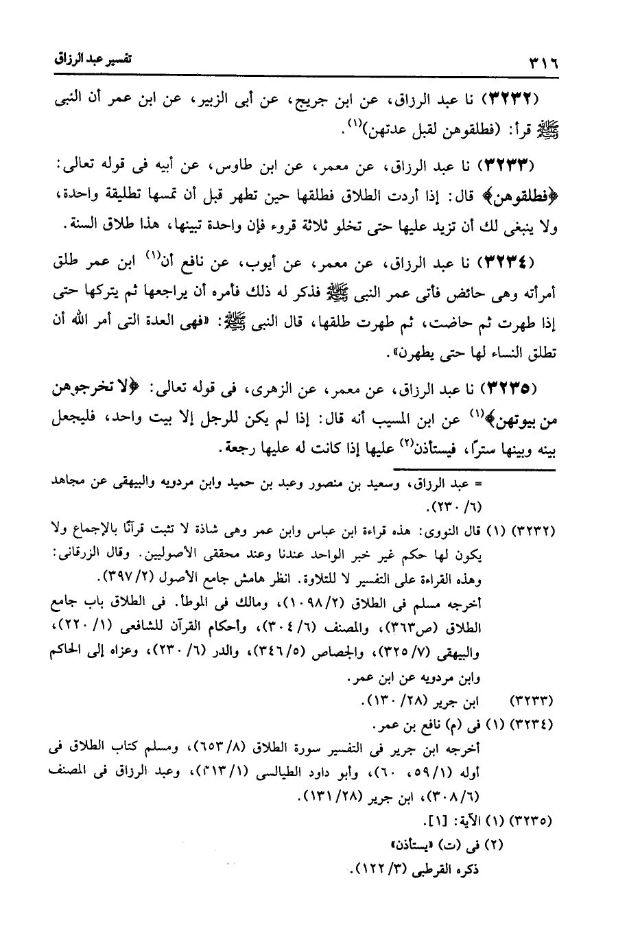 3233 - عَنْ مَعْمَرٍ , عَنِ ابْنِ طَاوُسٍ , عَنْ أَبِيهِ , فِي قَوْلِهِ تَعَالَى: {فَطَلِّقُوهُنَّ} [الطلاق: 1] قَالَ: «§إِذَا أَرَدْتَ الطَّلَاقَ فَطَلِّقْهَا حِينَ تَطْهُرُ , قَبْلَ أَنْ تَمَسَّهَا تَطْلِيقَةً وَاحِدَةً , وَلَا يَنْبَغِي لَكَ أَنْ تَزِيدَ عَلَيْهَا حَتَّى تَخْلُوَ ثَلَاثَةَ قُرُوءٍ , فَإِنَّ وَاحِدَةً تُبِينُهَا , هَذَا طَلَاقُ السُّنَّةِ»