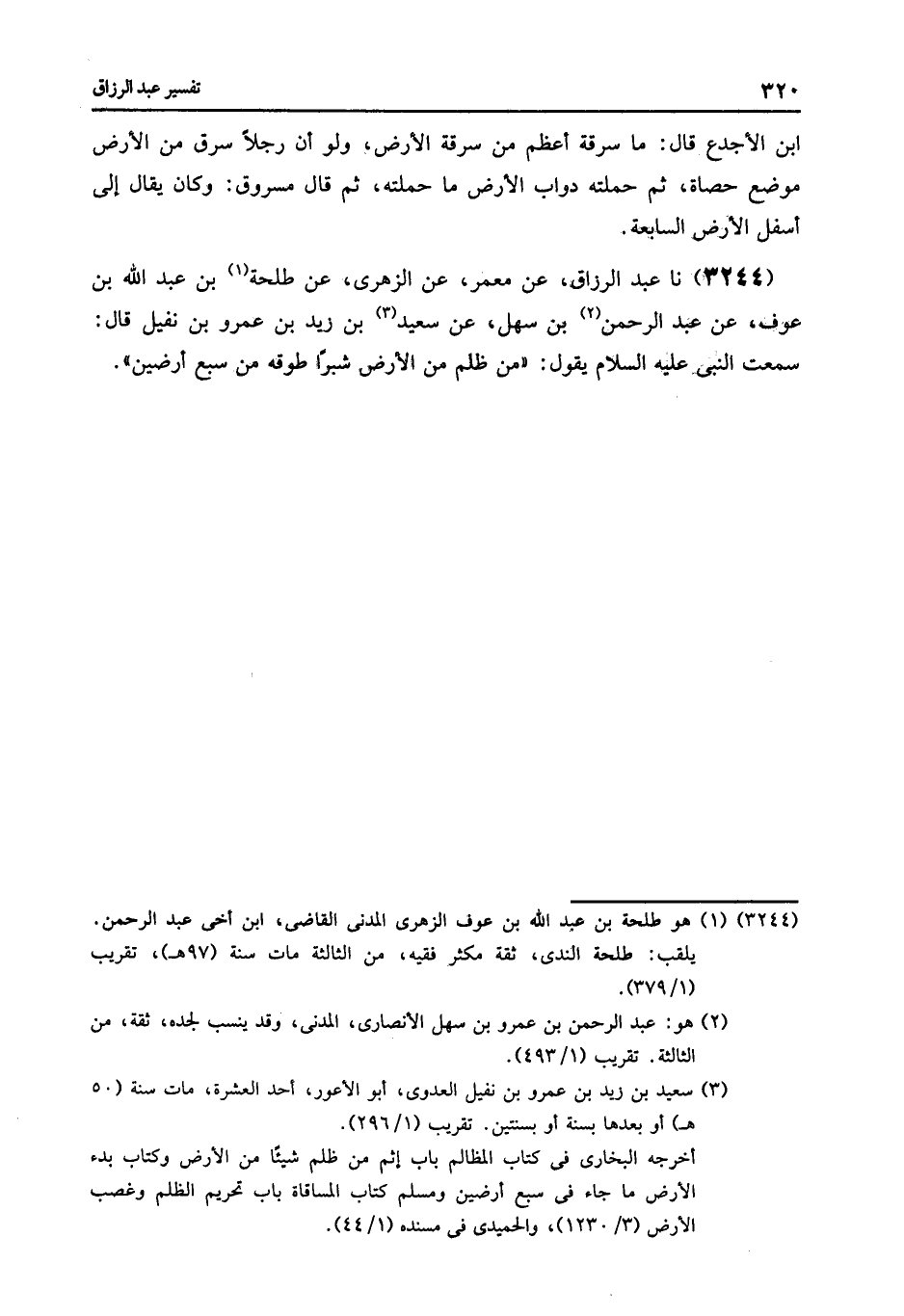 3244 - عَنْ مَعْمَرٍ , عَنِ الزُّهْرِيِّ , عَنْ طَلْحَةَ بْنِ عَبْدِ اللَّهِ بْنِ عَوْفٍ , عَنْ عَبْدِ الرَّحْمَنِ بْنِ سَهْلٍ , عَنْ سَعِيدِ بْنِ زَيْدِ بْنِ عَمْرِو بْنِ نُفَيْلٍ , قَالَ: سَمِعْتُ النَّبِيَّ صَلَّى اللهُ عَلَيْهِ وَسَلَّمَ يَقُولُ: «§مَنْ ظَلَمَ مِنَ الْأَرْضِ شِبْرًا , طُوِّقَهُ مِنْ سَبْعِ أَرَضِينَ»