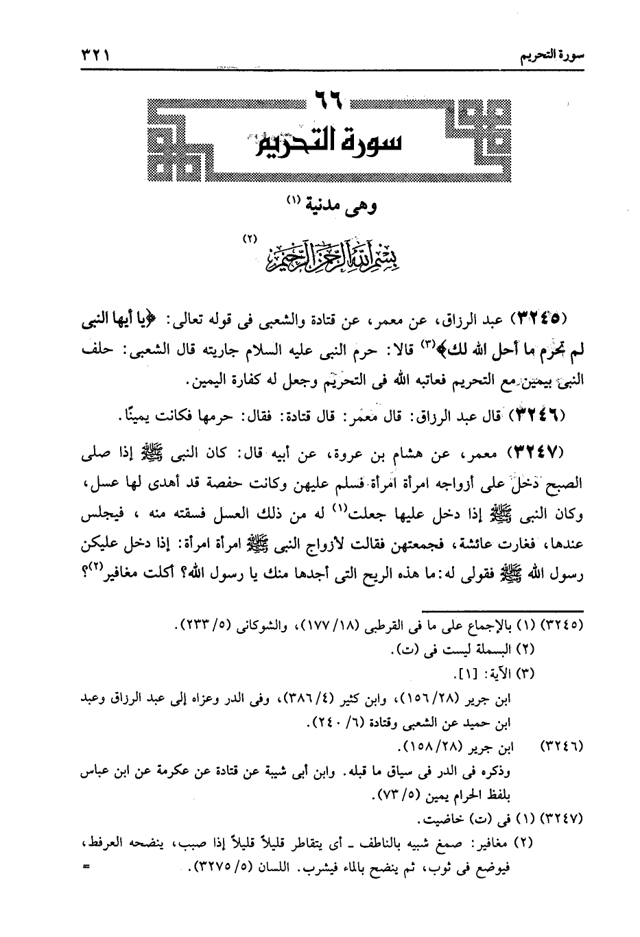 3245 - عَنْ مَعْمَرٍ , عَنْ قَتَادَةَ , وَالشَّعْبِيِّ , فِي قَوْلِهِ تَعَالَى: {يَا أَيُّهَا النَّبِيُّ لِمَ تُحَرِّمُ مَا أَحَلَّ اللَّهُ لَكَ} [التحريم: 1] قَالَا: حَرَّمَ النَّبِيُّ عَلَيْهِ السَّلاَمُ , جَارِيَتَهُ , قَالَ الشَّعْبِيُّ: «§حَلَفَ النَّبِيُّ , بِيَمِينٍ مَعَ التَّحْرِيمِ فَعَاتَبَهُ اللَّهُ فِي التَّحْرِيمِ وَجَعَلَ لَهُ كَفَّارَةَ الْيَمِينِ»