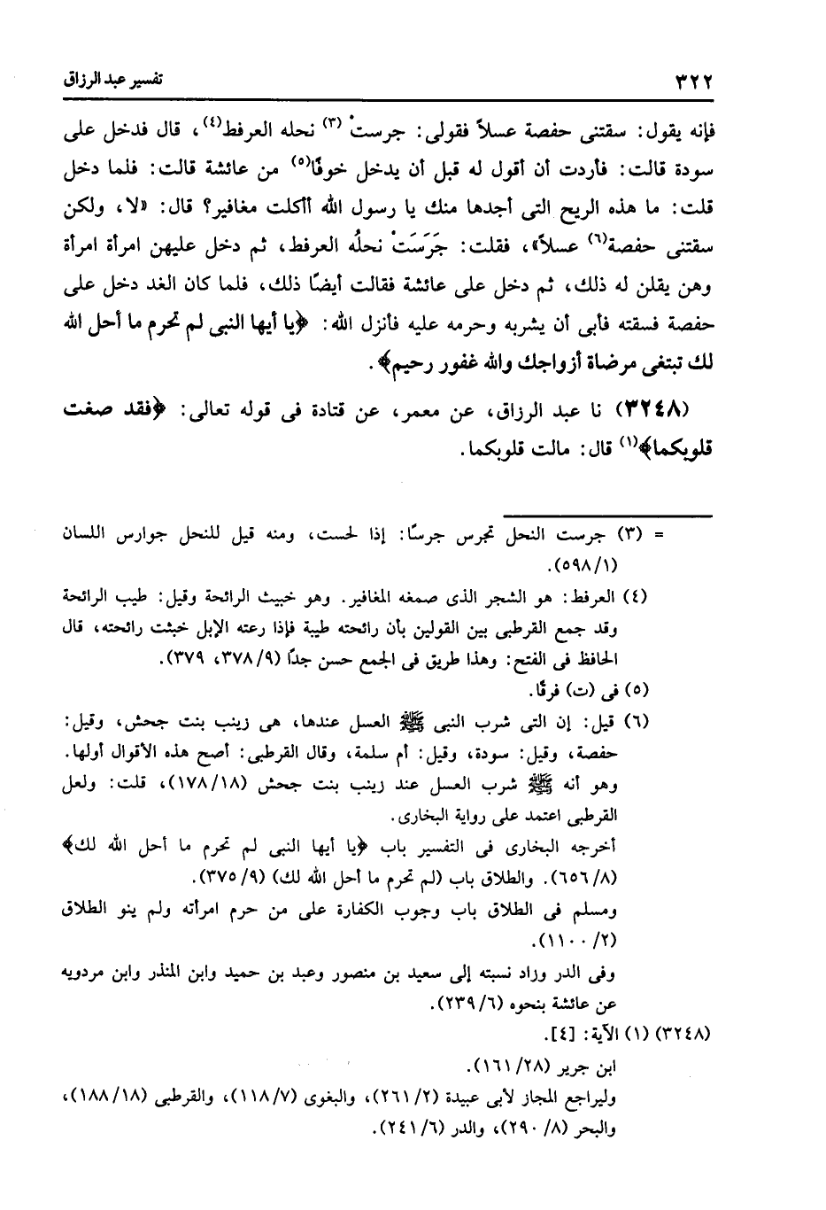 3247 - مَعْمَرٌ , عَنْ هِشَامِ بْنِ عُرْوَةَ , عَنْ أَبِيهِ , قَالَ: كَانَ النَّبِيُّ صَلَّى اللهُ عَلَيْهِ وَسَلَّمَ , إِذَا صَلَّى الصُّبْحَ دَخَلَ عَلَى أَزْوَاجِهِ امْرَأَةً امْرَأَةً فَسَلَّمَ عَلَيْهِنَّ , وَكَانَتْ حَفْصَةُ قَدْ أُهْدِي لَهَا عَسَلٌ , وَكَانَ النَّبِيُّ صَلَّى اللهُ عَلَيْهِ وَسَلَّمَ , إِذَا دَخَلَ عَلَيْهَا جَعَلَتْ لَهُ مِنْ ذَلِكَ الْعَسَلِ فَسَقَتْهُ مِنْهُ , فَيَجْلِسُ عِنْدَهَا فَغَارَتْ عَائِشَةُ فَجَمَعَتْهُنَّ , فَقَالَتْ لِأَزْوَاجِ النَّبِيِّ صَلَّى اللهُ عَلَيْهِ وَسَلَّمَ امْرَأَةً امْرَأَةً إِذَا دَخَلَ عَلَيْكُنَّ رَسُولُ اللَّهِ صَلَّى اللهُ عَلَيْهِ وَسَلَّمَ فَقُولِي لَهُ مَا هَذِهِ الرِّيحُ الَّتِي أَجِدُهَا مِنْكَ يَا رَسُولَ اللَّهِ , أَأَكَلْتَ مَغَافِيرَ؟ فَإِنَّهُ سَيَقُولُ: سَقَتْنِي حَفْصَةُ عَسَلًا , فَقُولِي: جَرَسَتْ نَحْلُهُ الْعُرْفُطَ , قَالَ: فَدَخَلَ عَلَى سَوْدَةَ , قَالَتْ: فَأَرَدْتُ أَنْ أَقُولَ لَهُ قَبْلَ أَنْ يَدْخُلَ خَوْفًا مِنْ عَائِشَةَ , قَالَتْ: فَلَمَّا دَخَلَ قُلْتُ: مَا هَذِهِ الرِّيحُ الَّتِي أَجِدُهَا مِنْكَ يَا رَسُولَ اللَّهِ أَأَكَلَتْ مَغَافِيرَ؟ قَالَ: «لَا وَلَكِنْ سَقَتْنِي حَفْصَةُ عَسَلًا» فَقُلْتُ: جَرَسَتْ نَحْلُهُ الْعُرْفُطَ , ثُمَّ دَخَلَ عَلَيْهِنَّ امْرَأَةً امْرَأَةً وَهُنَّ يَقُلْنَ لَهُ ذَلِكَ , ثُمَّ دَخَلَ عَلَى عَائِشَةَ , فَقَالَتْ لَهُ أَيْضًا ذَلِكَ , فَلَمَّا كَانَ الْغَدُ دَخَلَ عَلَى حَفْصَةَ فَسَقَتْهُ فَأَبَى أَنْ يَشْرَبَهُ وَحَرَّمَهُ عَلَيْهِ , فَأَنْزَلَ اللَّهُ: {§يَا أَيُّهَا النَّبِيُّ لِمَ تُحَرِّمُ مَا أَحَلَّ اللَّهُ لَكَ تَبْتَغِي مَرْضَاةَ أَزْوَاجِكَ وَاللَّهُ غَفُورٌ رَحِيمٌ}
