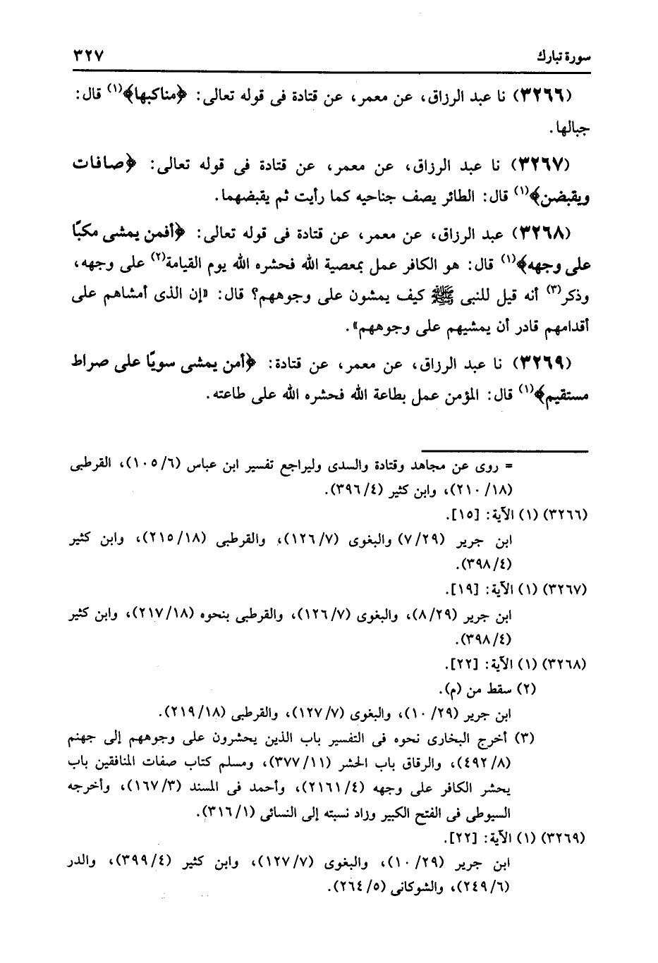 3269 - عَنْ مَعْمَرٍ , عَنْ قَتَادَةَ: {أَمَّنْ يَمْشِي سَوِيًّا عَلَى صِرَاطٍ مُسْتَقِيمٍ} [الملك: 22] قَالَ: «§الْمُؤْمِنُ عَمِلَ بِطَاعَةِ اللَّهِ فَحَشَرَهُ اللَّهُ عَلَى طَاعَتِهِ»